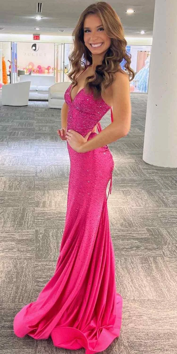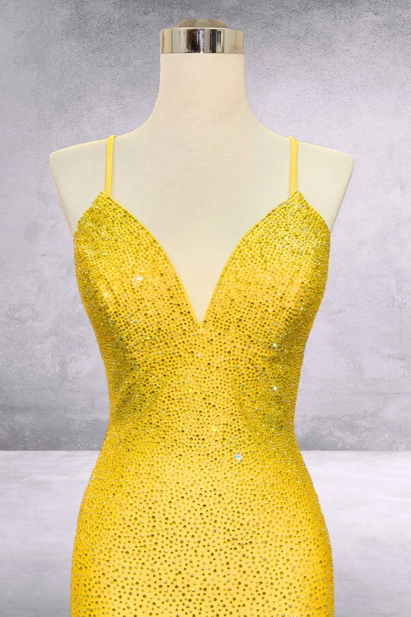 The Amelia Couture 3018 is a show-stopping floor length gown crafted with a fitted mermaid silhouette and intricate heat stone bead embellishments. Featuring a spaghetti strap V-neckline, strappy crisscross open back, and a sweep train, this luxe lycra gown is sure to make a lasting impression. An ideal full-length dress for red carpet events, pageant, prom or in any other formal occasions!Â