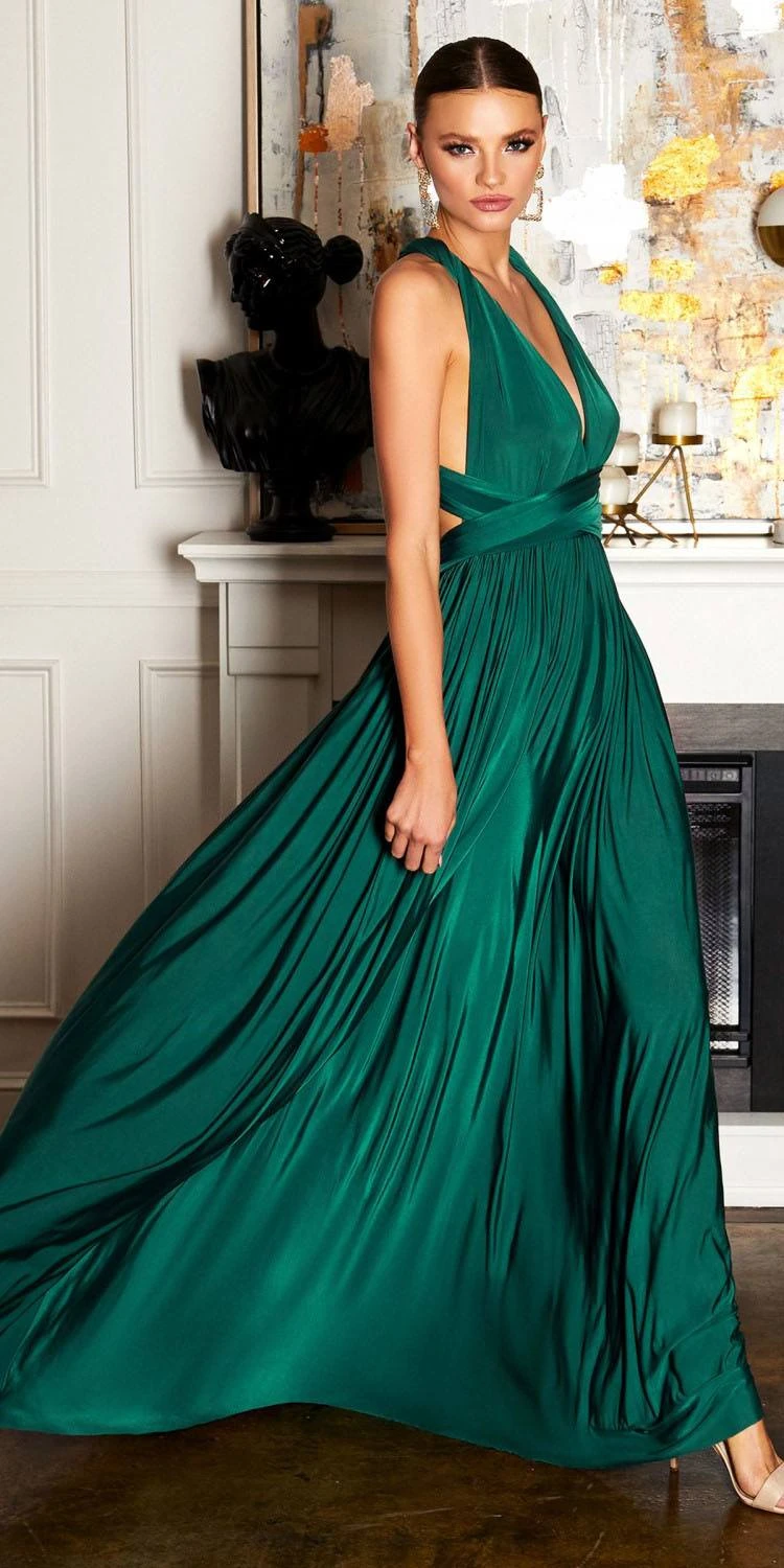 Imagine yourself wearing this beautiful floor length A-line stretch satin evening gown for your next formal event. This convertible formal dress by Cinderella Divine CV01P transforms into multiple looks for any occasion. The front panels can be tied & wrapped around the body as the wearer desires. It also comes with a bandeau for ladies who want extra coverage for their chest.  The stretch in this dress makes it ideal and very flexible to maneuver and fit in. Â
