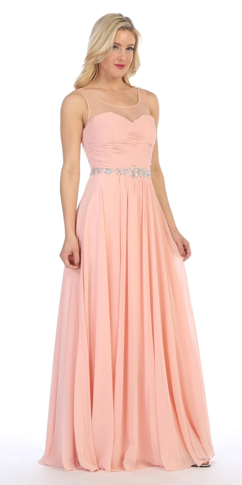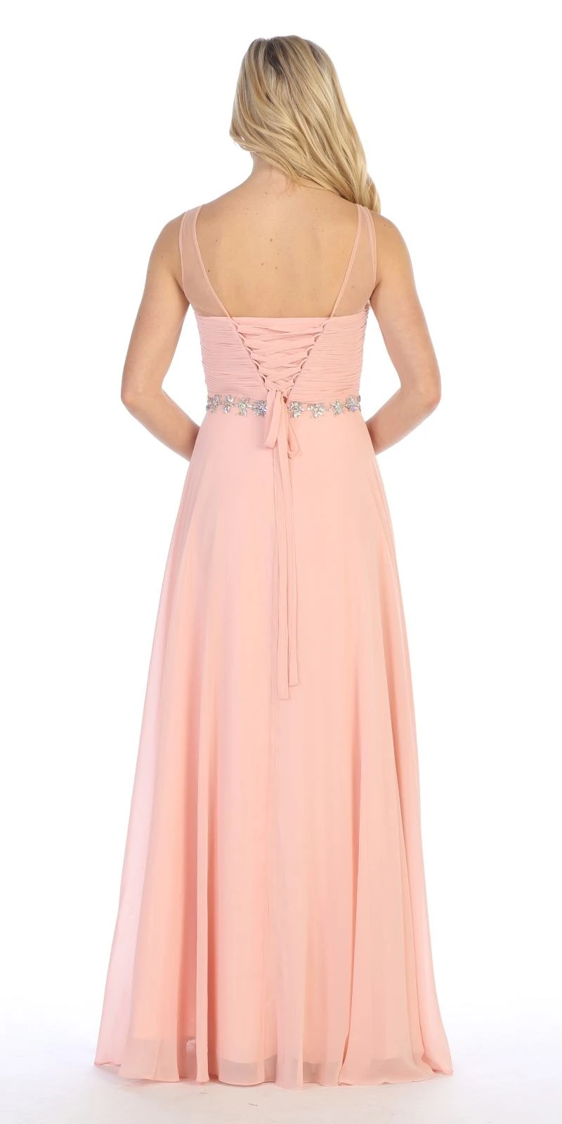 Step into this elegant floor length formal dress in blush. Made with chiffon, this full length a-line dress is sleeveless with illusion bateau neckline and features a ruched bodice with rhinestone waistband embellishments and a corset lace up open back.Â