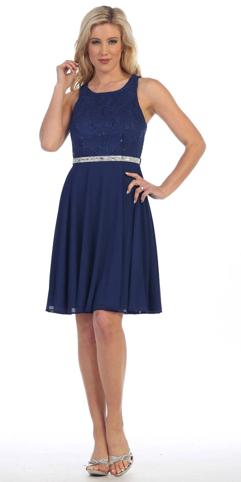 Step into this classic knee length cocktail dress. Made with lace top and chiffon skirt, this short a-line dress is sleeveless with a scoop neckline and features a lace bodice embellished with sequins and a rhinestones in the waistline.Â