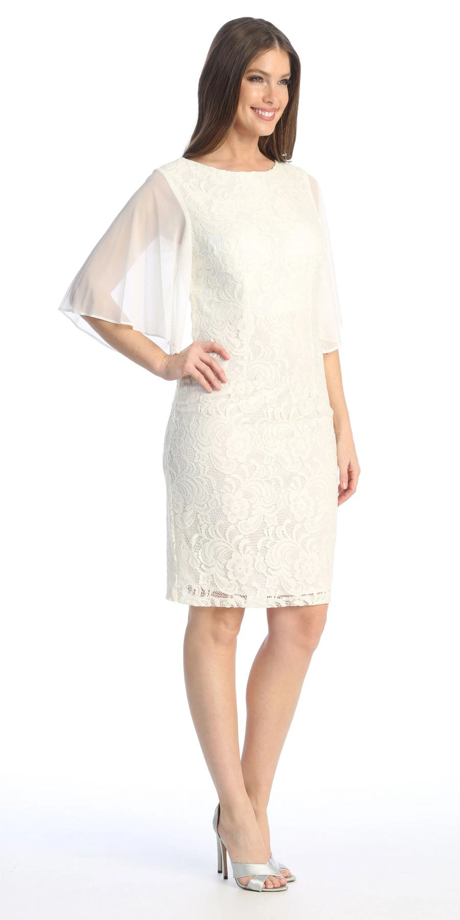 Knee-length lace dress by Celavie 6289. This gorgeous dress is made of lace with ultra-feminine sheer flutter sleeves. This short dress has bateau neckline and V-shape back, an excellent outfit for wedding events, cocktail party or dinner party. Â