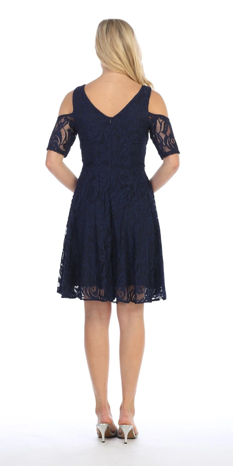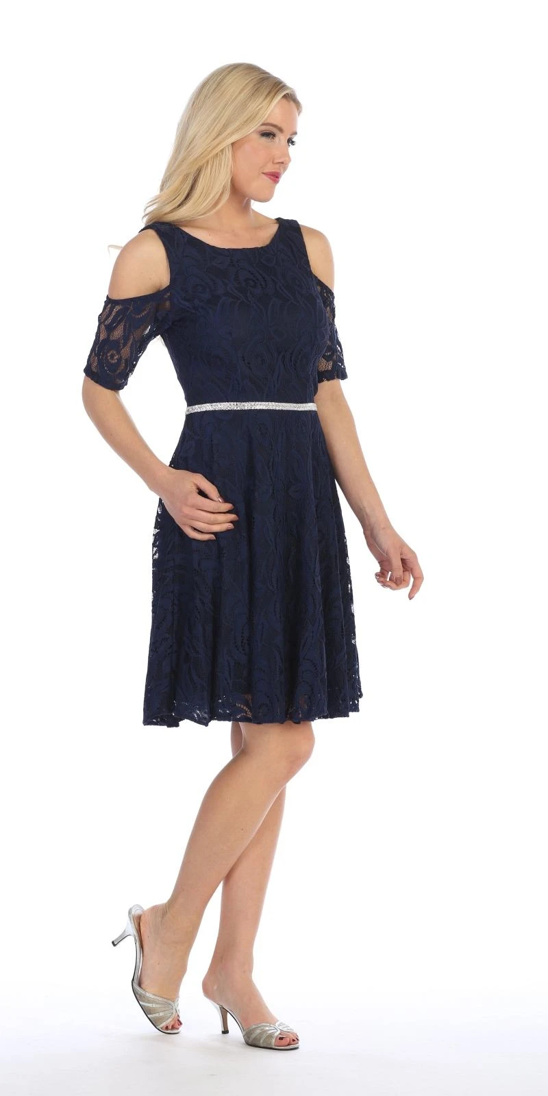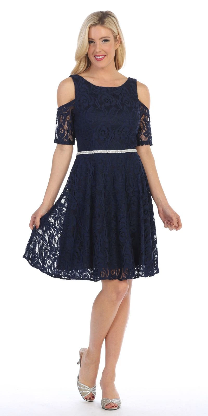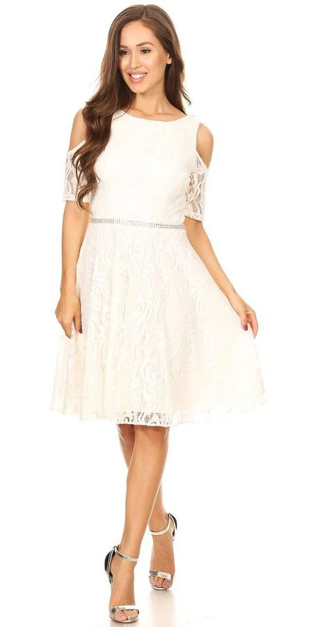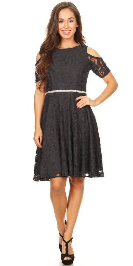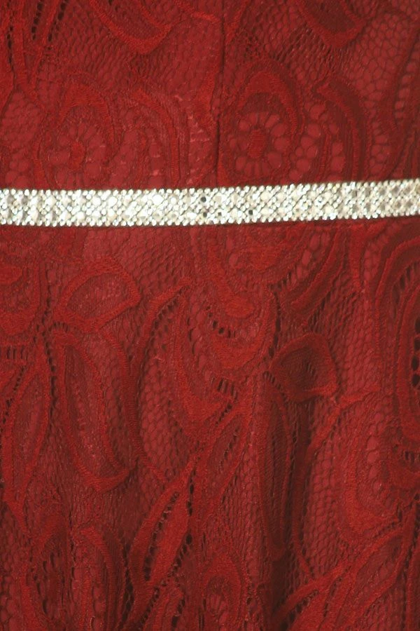 Gorgeously beautiful a-line wedding guest short dress from Celavie 6307 in burgundy. This lace dress with boat neckline features a trendy style cold shoulder short sleeves and a sparkling rhinestones embellishes the waistline.