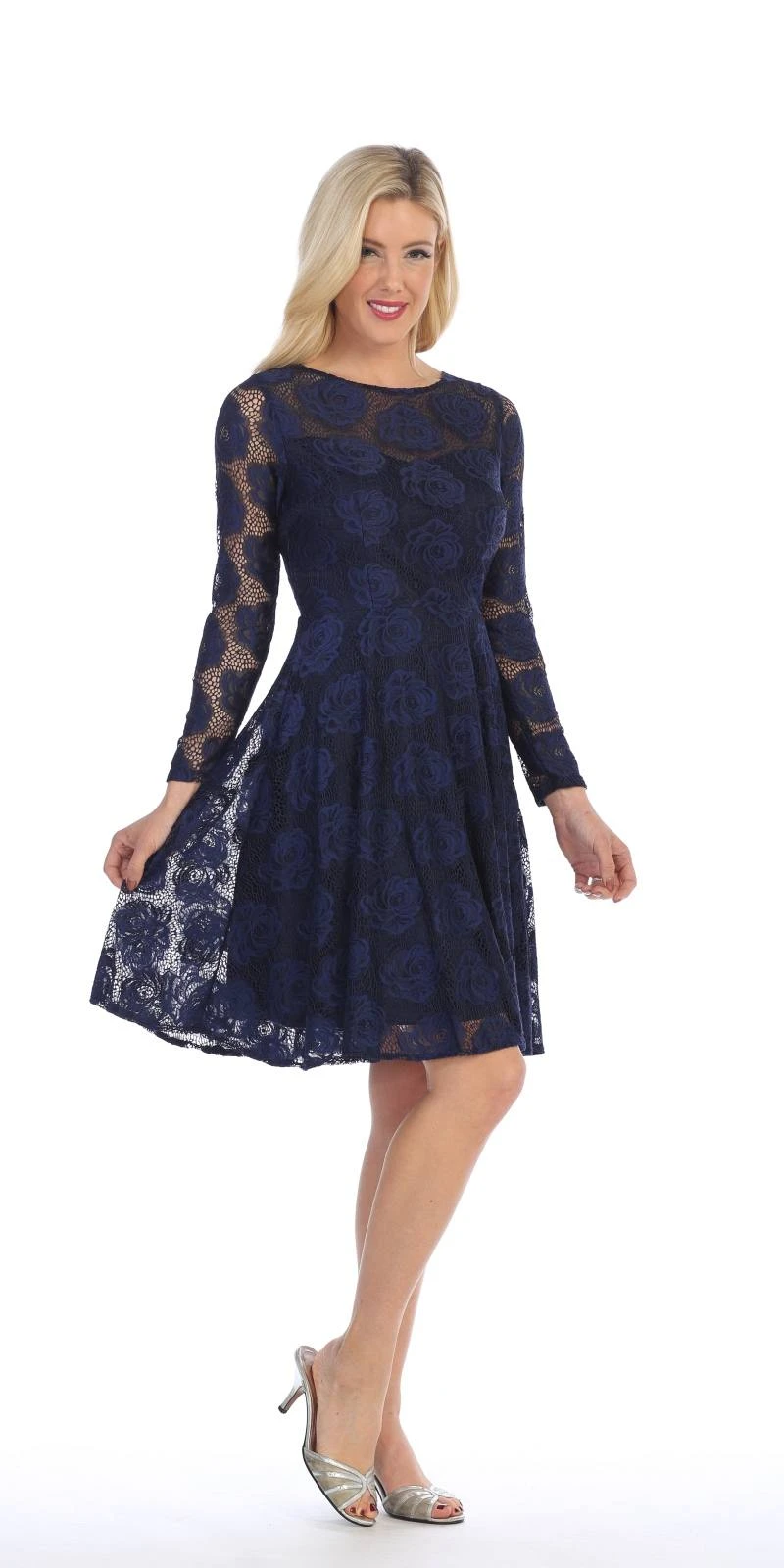 Elegant knee-length wedding guest dress by Celavie 6327. Made with corded lace, this A-line dress features a scoop neckline with long sleeves, this is a perfect dress for any formal, semi formal or modest occasions.