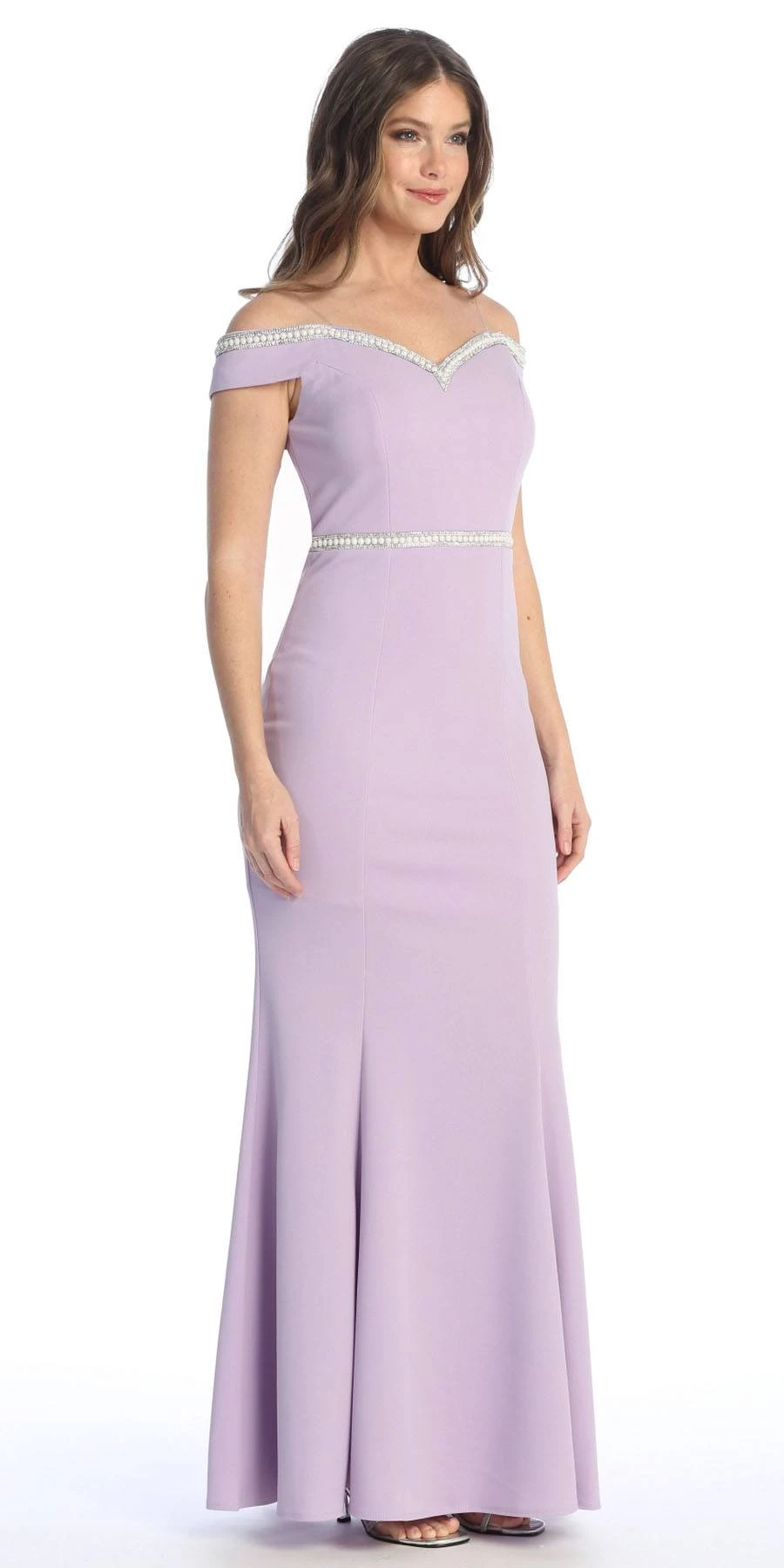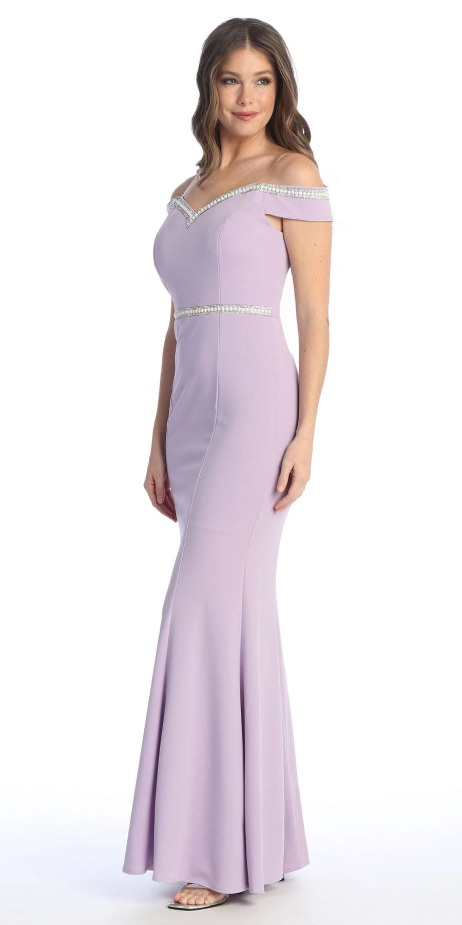 Stand out and shine wearing this mermaid style evening gown by Celavie 6348. Featuring an off-shoulder style with V-neck which beautifully outlined with sequins and beaded strips as well as the natural waist. This fit and flare ity-jersey full-length gown is perfectly made for prom, red carpet events, gala or awards night or in any other formal occasions!