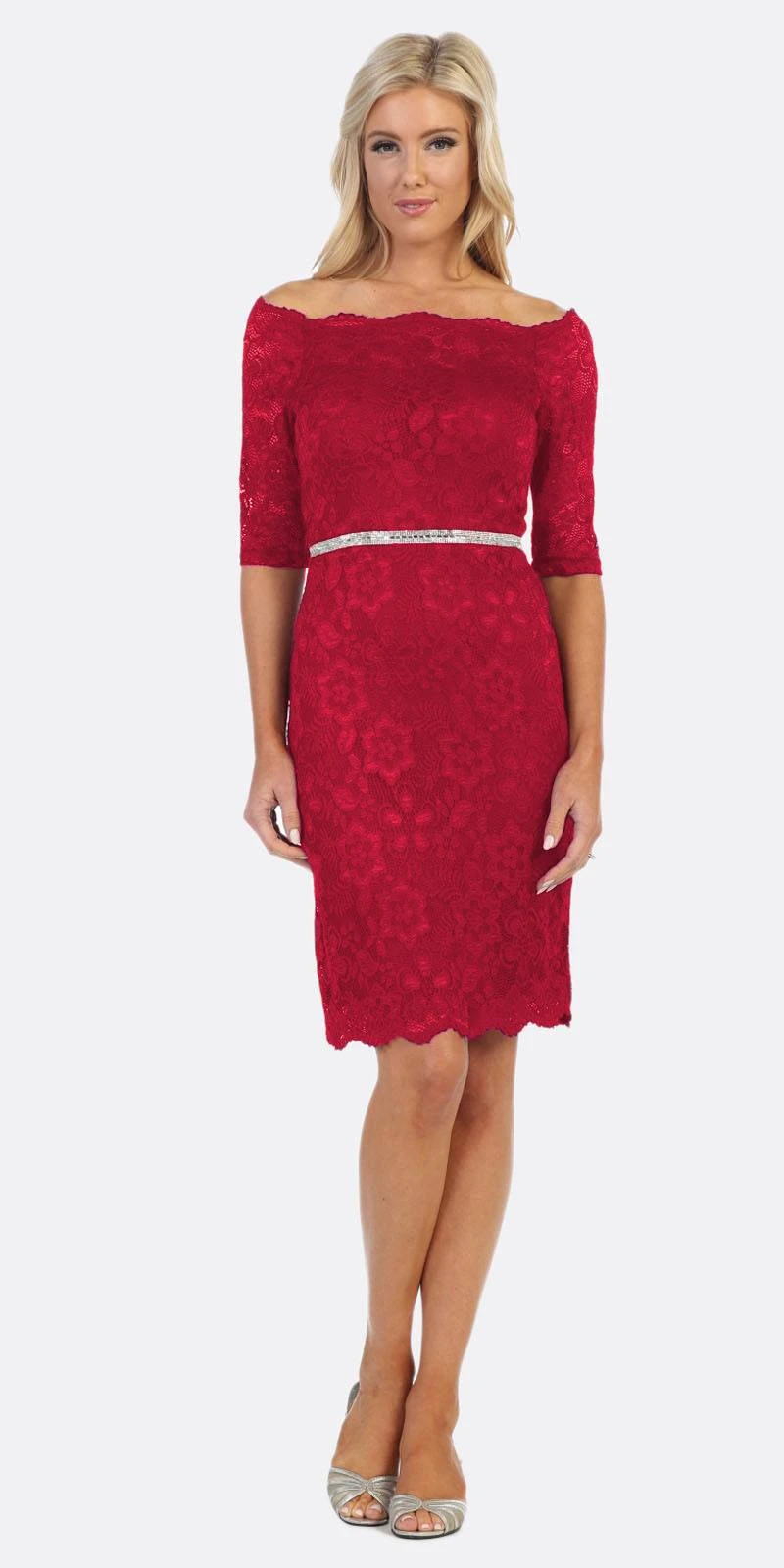 Step into this gorgeous made of lace knee-length dress by Celavie 6390, with mid-length sleeves. A sparkling beads and rhinestones brighten up the natural waist. This off-the-shoulder sheath silhouette dress is a perfect outfit for wedding guests, birthdays or holiday celebrations or in any other semi-formal events.