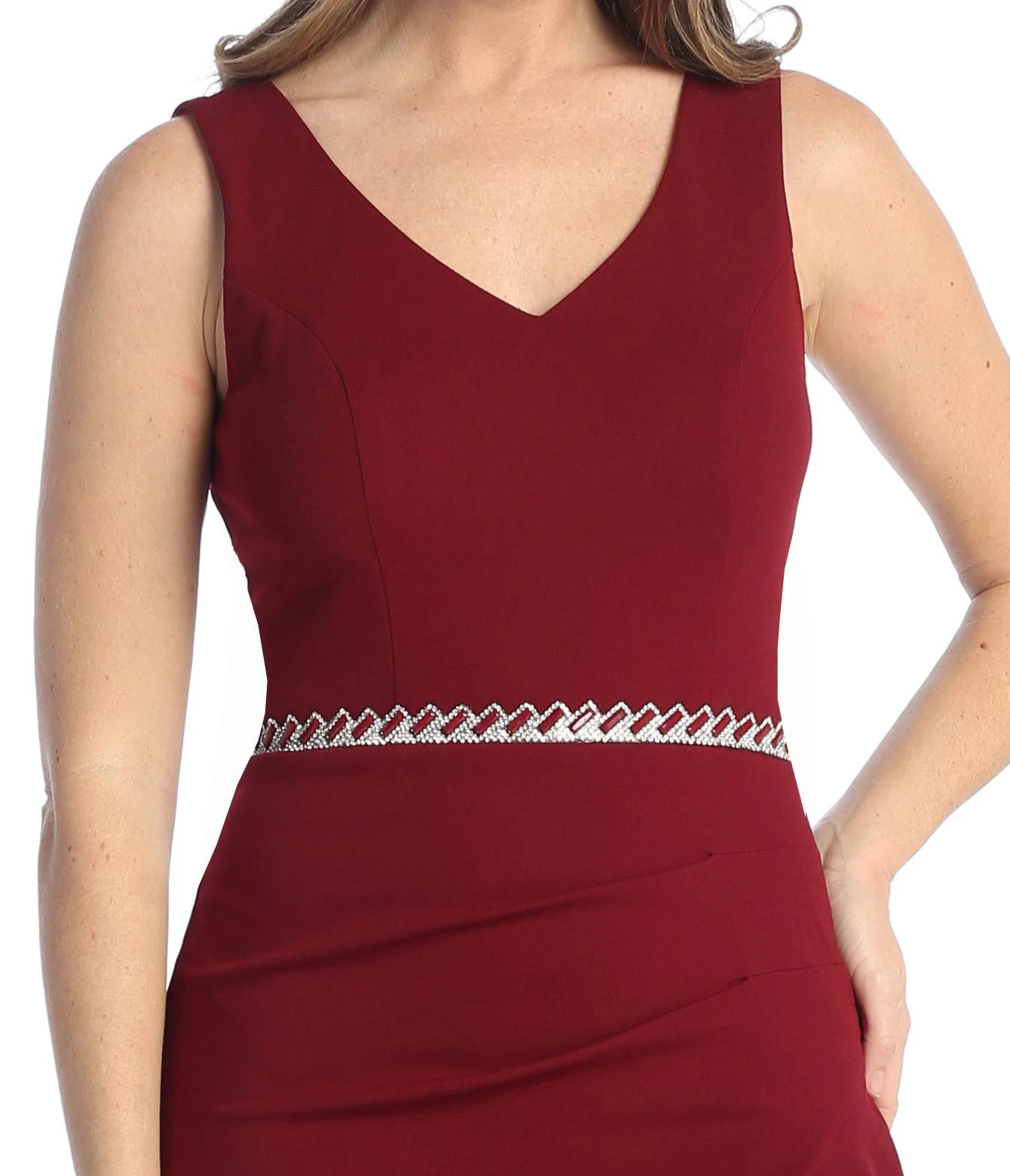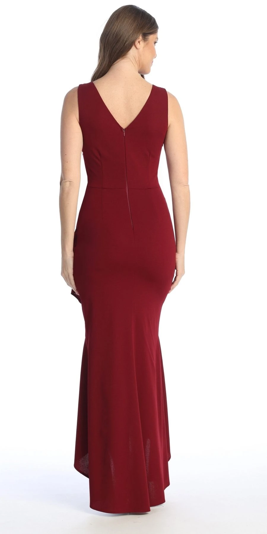 Imagine yourself wearing this full-length fitted gown for your next special event by Celavie 6554-L. This sleeveless formal dress features a V-neckline, embellished waist, ruffled asymmetrical leg slit and V-back. An ideal sleeveless dress for dinner party, semi-formal, wedding guest or in any other formal occasions!