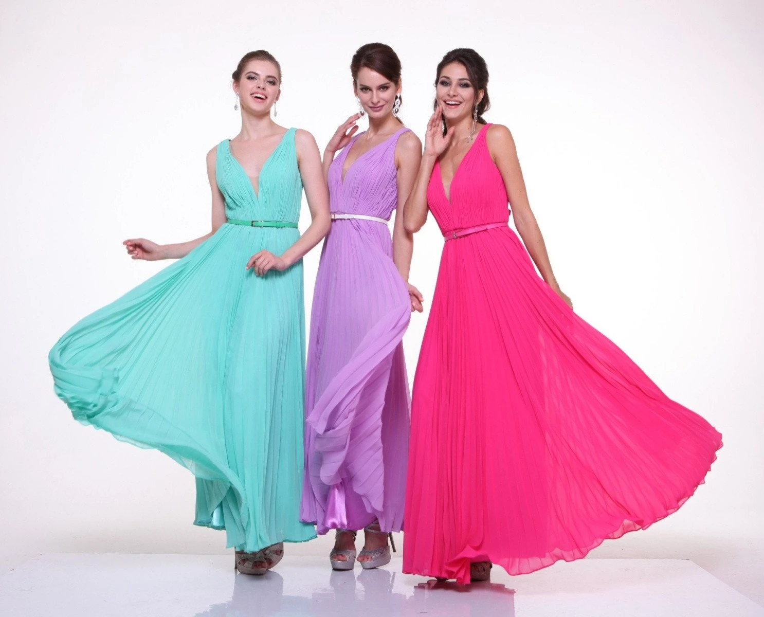 REDUCED PRICE!!! Imagine yourself in this beautiful floor length pleated evening gown for your next formal event. This sleeveless formal dress by Cinderella Divine 1499 in mint has a V-neckline with sheer insert and features a belt around the waist and a V-back. An ideal full-length dress for bridesmaid, pageant, prom or in any other formal occasions!Â