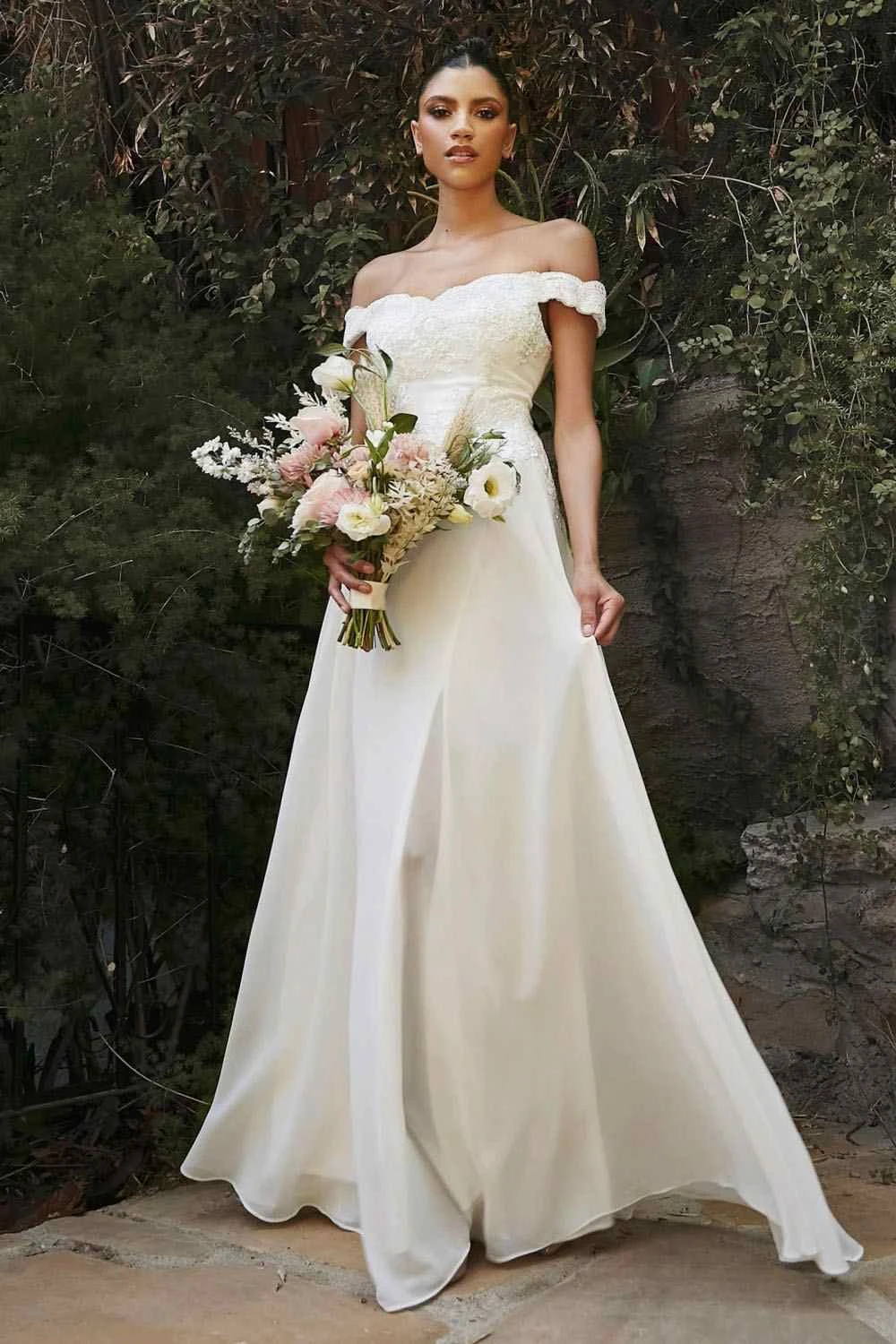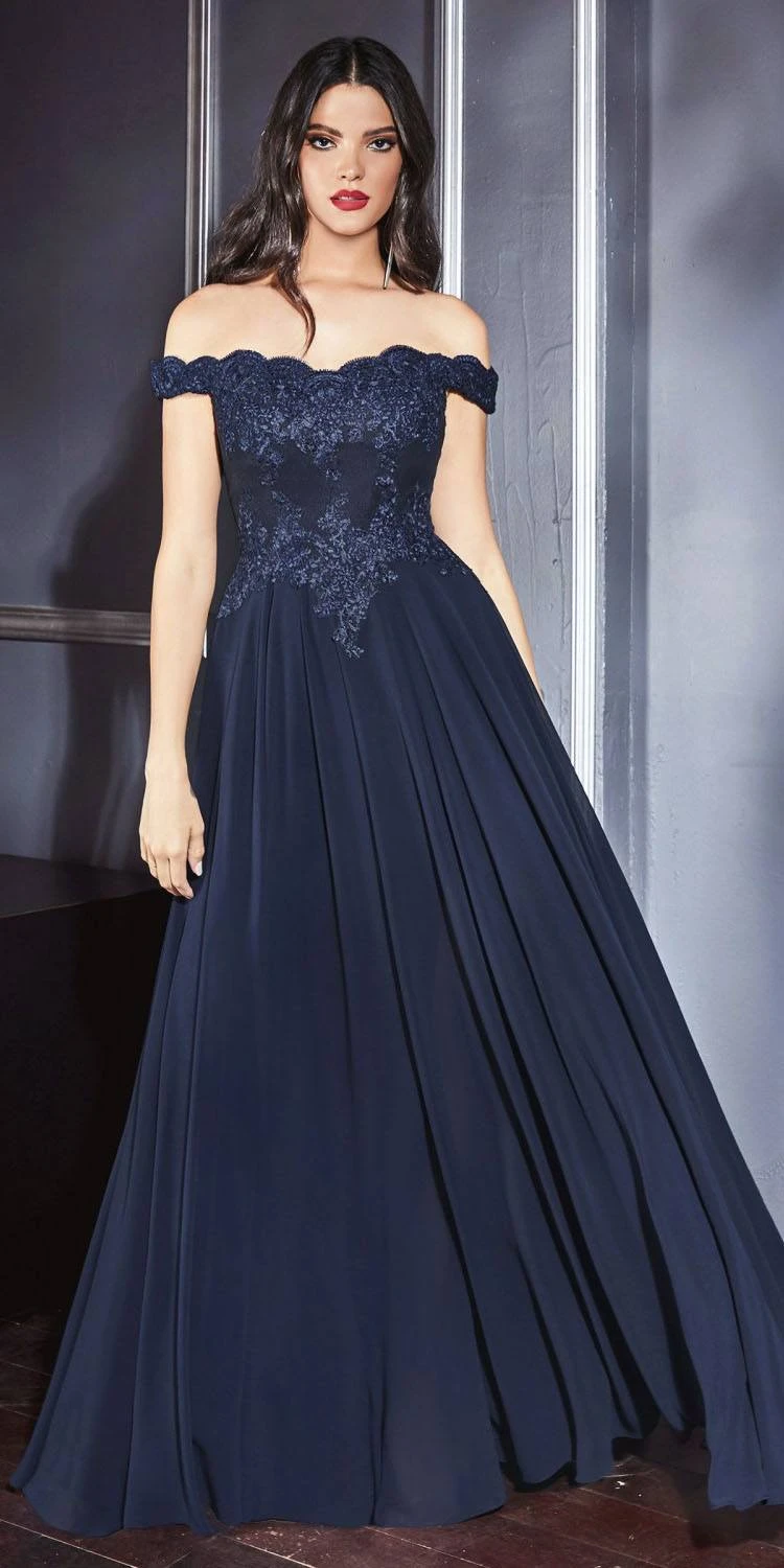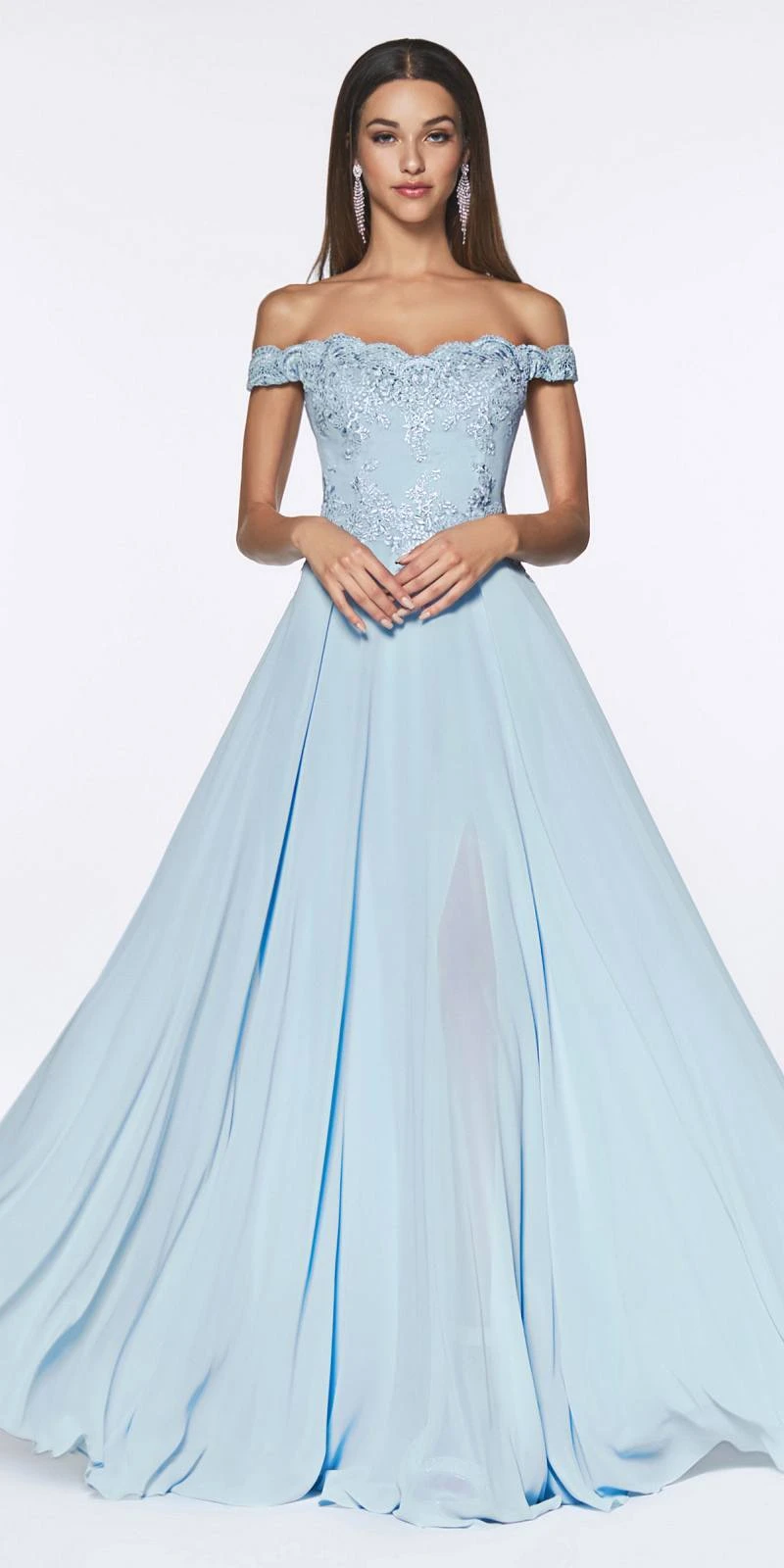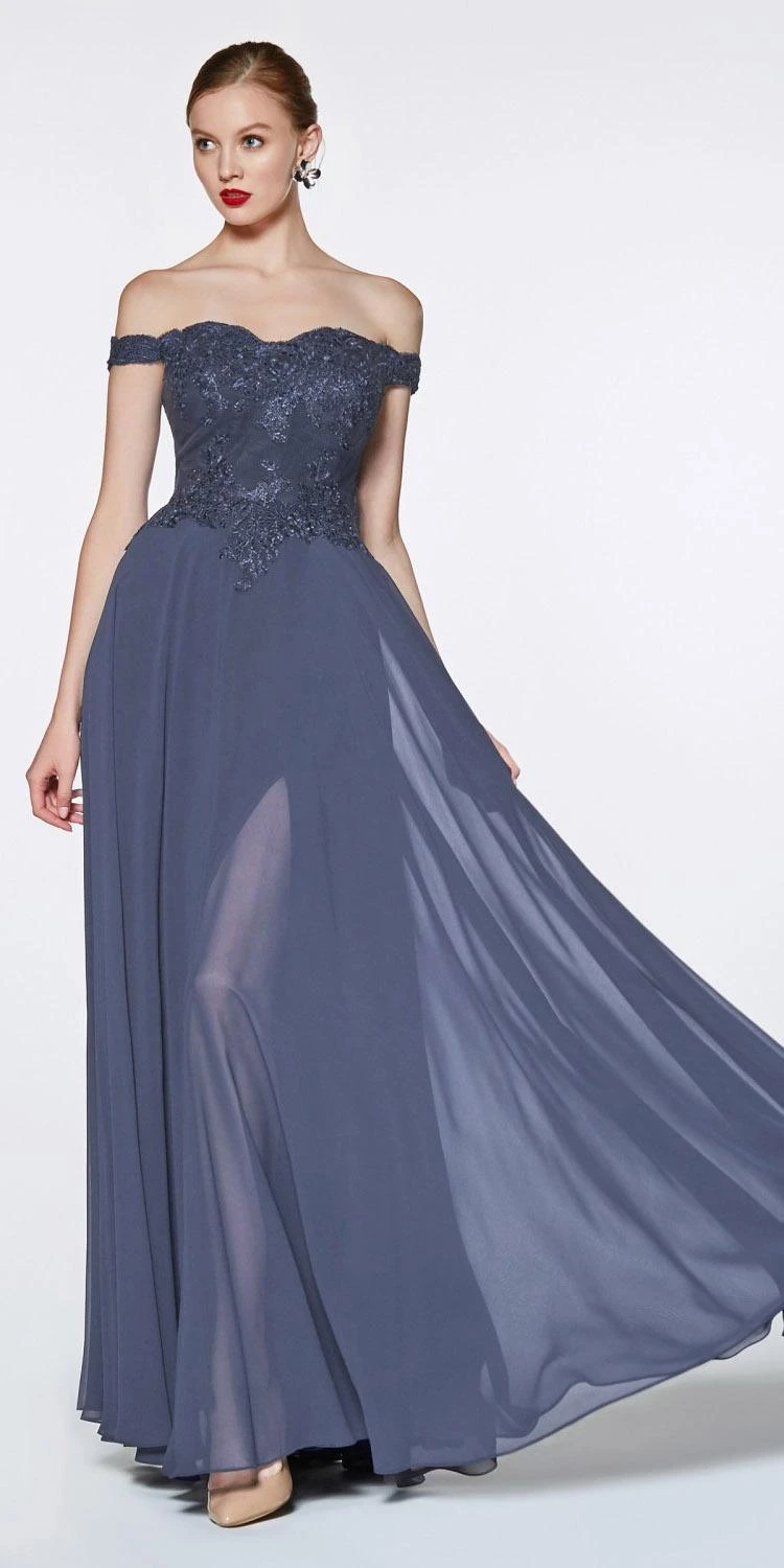 Enjoy the evening wearing this scalloped off the shoulder neckline by Cinderella Divine 7258W, which crowns the fitted beaded lace bodice as the natural waist is cinched. The full chiffon skirt beautifully cascades to the floor as it finishes with a leg slit in lining. The back is mid-open in V-shaped enclosed with a center zipper closure. An ideal full-length dress for bridesmaids, pageant, prom or in any other formal occasions! Â