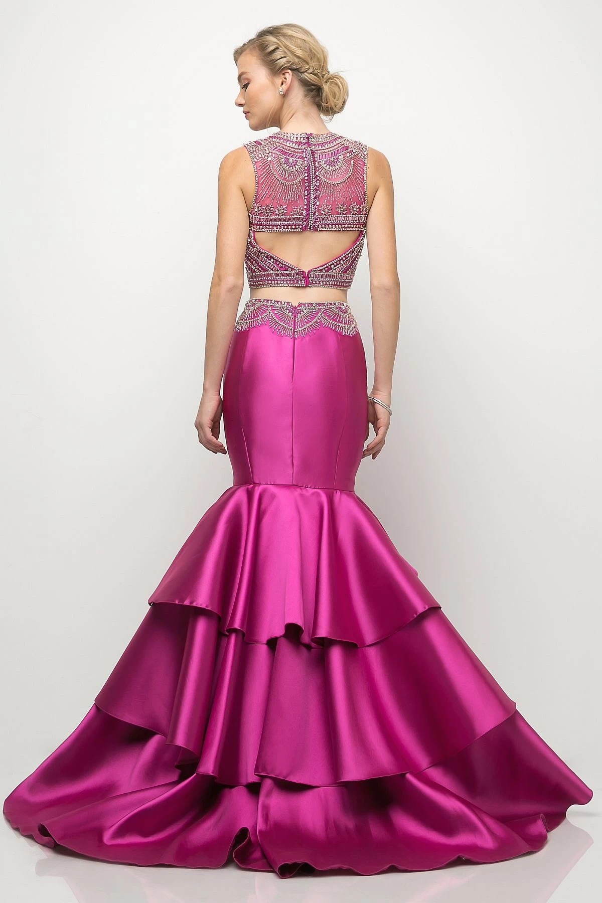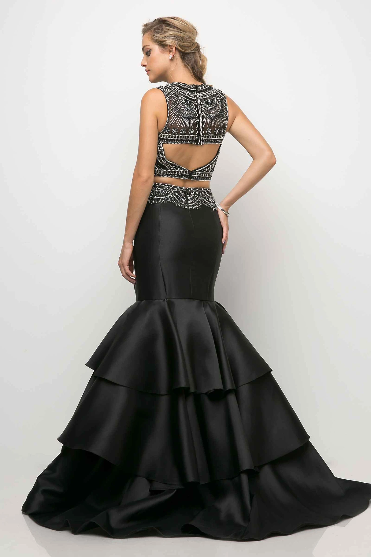 Enjoy the evening in this beautiful floor length 2-piece mermaid gown by Cinderella Divine 83903, which features a beaded bodice with a high neckline, a mermaid skirt with cascading layers and a cut-out back. A great long mermaid dress for prom, formal or any special occasion!