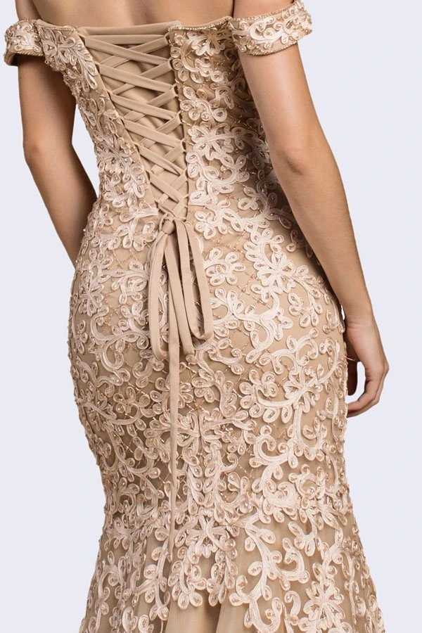 Enjoy the evening in this glamorous mermaid style evening gown with lace overlay and tulle skirt. An off-shoulder long formal dress by Cinderella Divine A0401, which features a semi-sweetheart neckline and corset lace-up back. An ideal dress for red carpet events, pageant, prom or in any other formal occasions!
