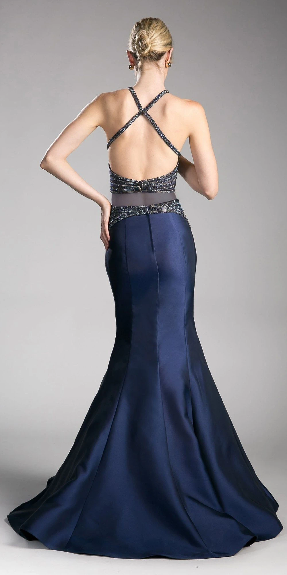Two-piece mermaid prom gown in navy blue by Cinderella Divine CB0023. Halter crop top with high neckline outlined with beads connected to the criss-crossing open back. The same bead outlined the crop top hem and the waist of mermaid floor length skirt. A stunning and perfect outfit for pageant or prom.