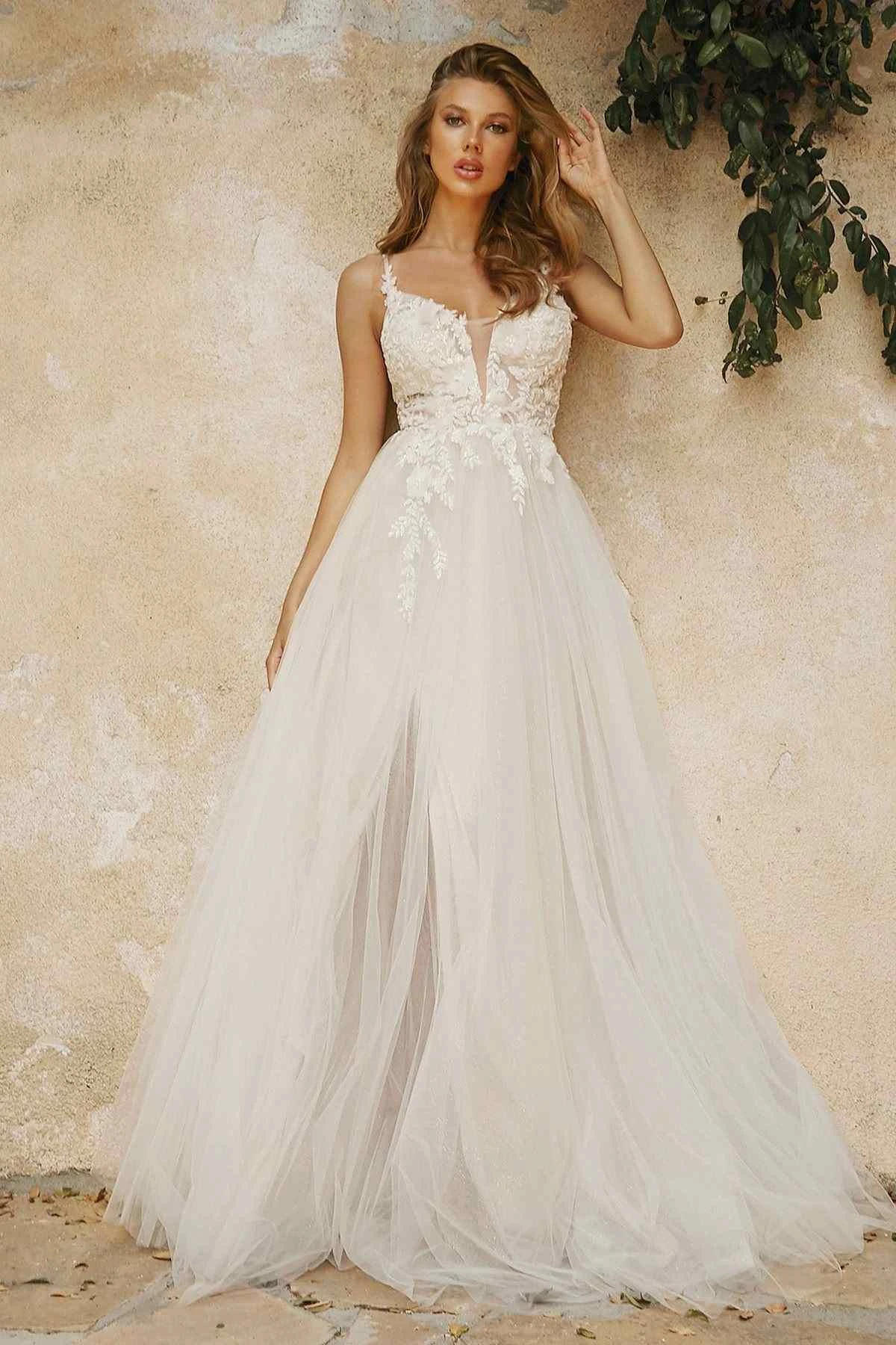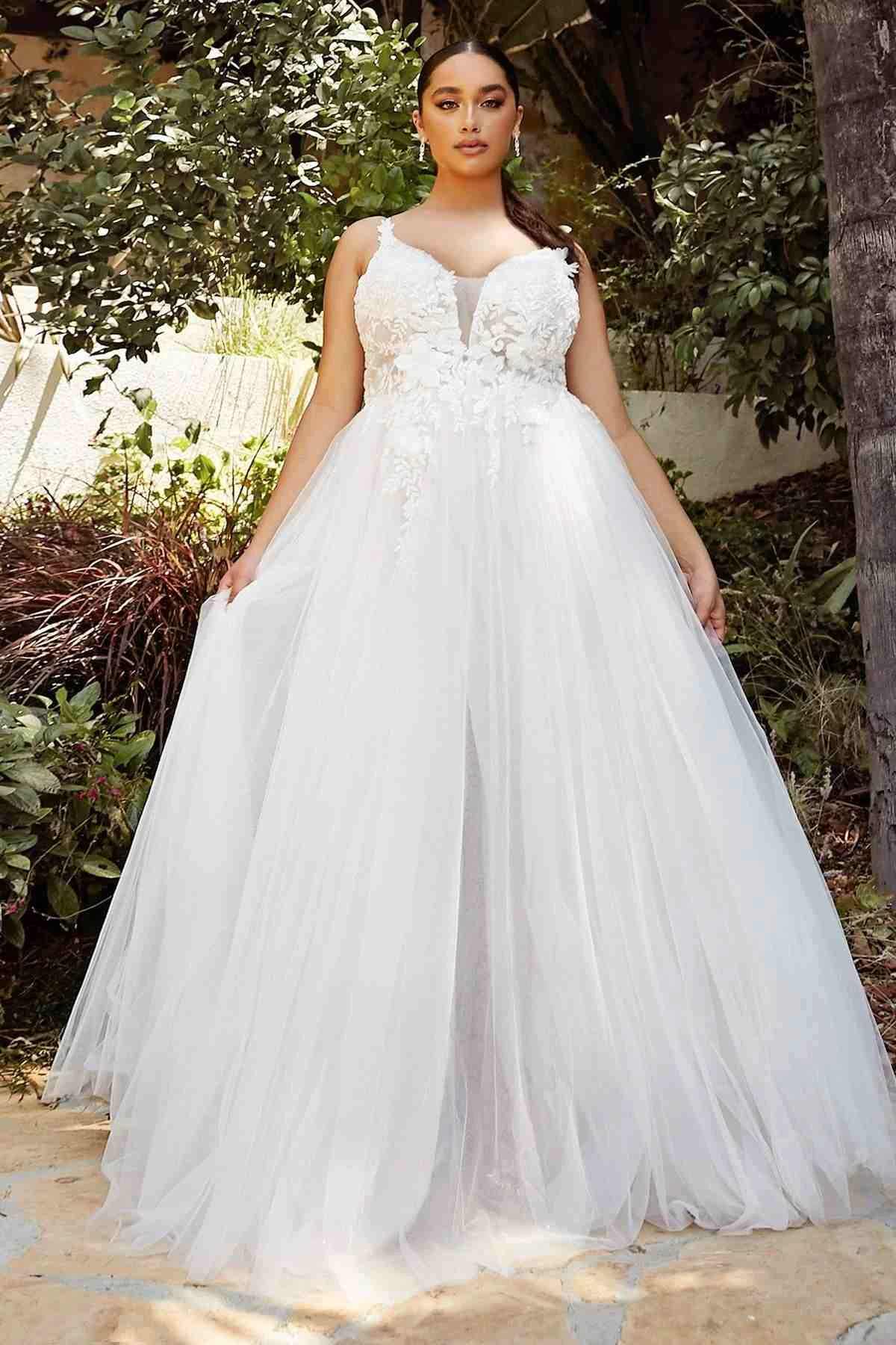 Imagine yourself as the most beautiful bride with this A-line silhouette ball gown by Cinderella Divine CB072W in off white, which features a sheer embroidered bodice with V-neckline adorned with swirling appliques and tiny dazzling beads that past the natural waist. This made of layered tulle, this wedding dress is fully lined supported with spaghetti straps, perfect wedding and debutante dress at a very affordable price!