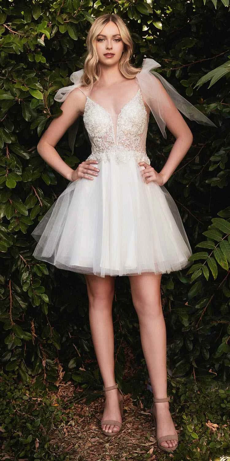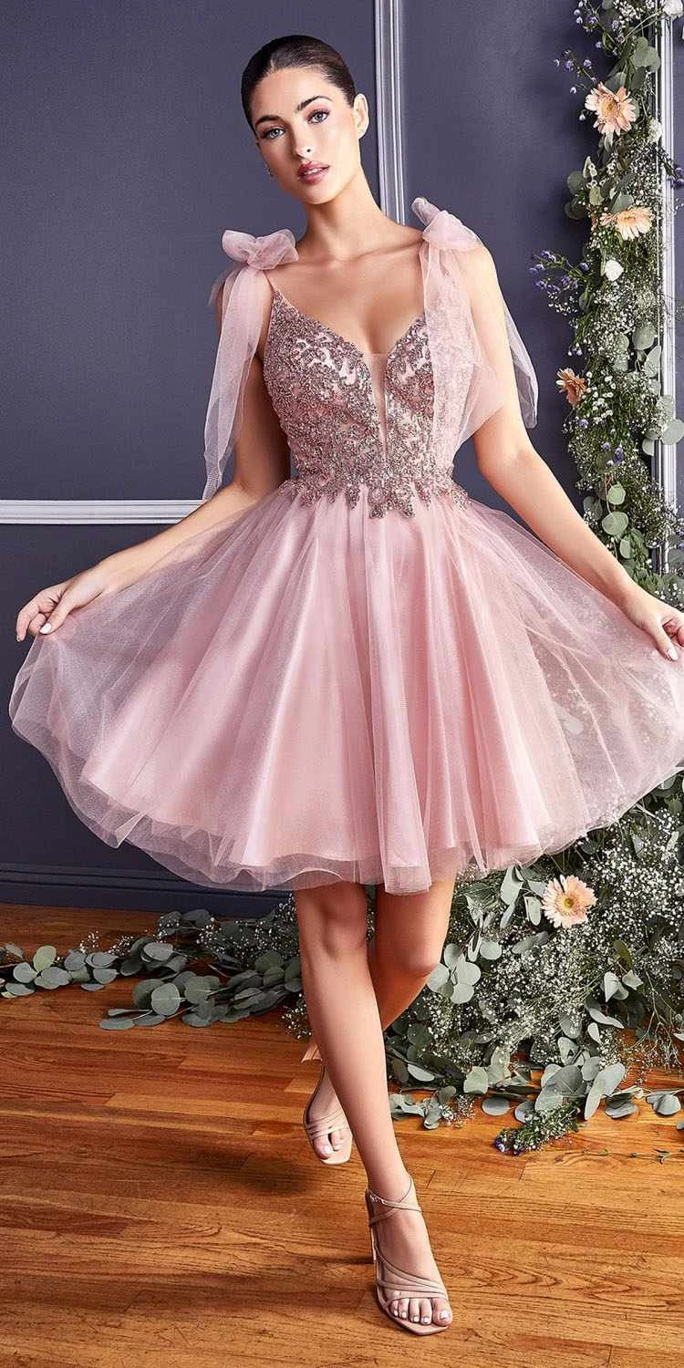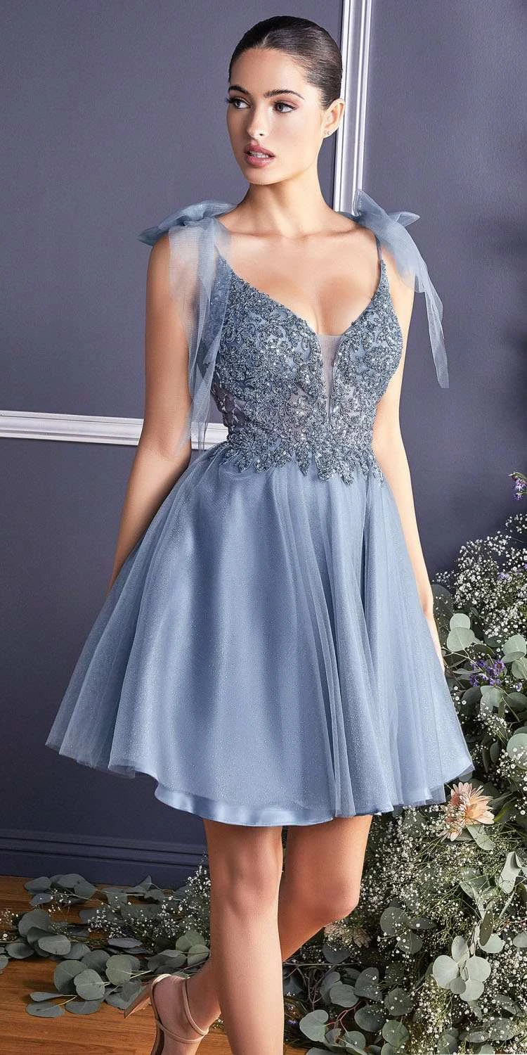 Imagine yourself in this beautiful short A-line party dress for your next formal event. This sleeveless formal dress by Cinderella Divine CD0174 has an open lace applique bodice decorated with embellishments and features spaghetti straps decorated with tulle ribbons and an open back.