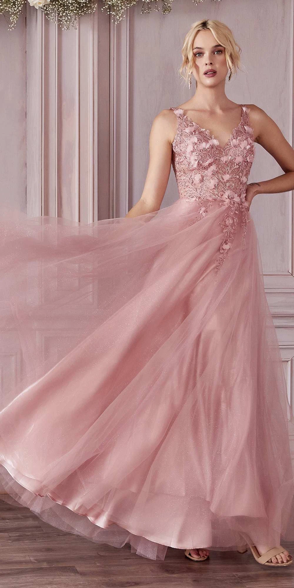Imagine yourself wearing this beautiful floor length lace floral A-line evening gown for your next formal event. This long sleeve formal dress by Cinderella Divine CD0181 is cut from layered tulle and embellished with a floral beaded lace and three-dimensional flowers blooming from the bodice. This fairytale gown has a v-neckline and open swoop back. An ideal full length dress for red carpet events, pageant, prom or in any other formal occasions! Â