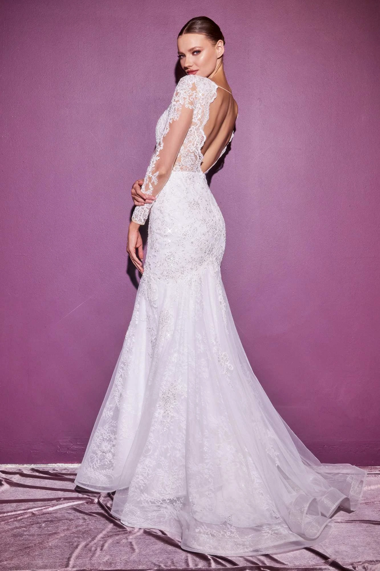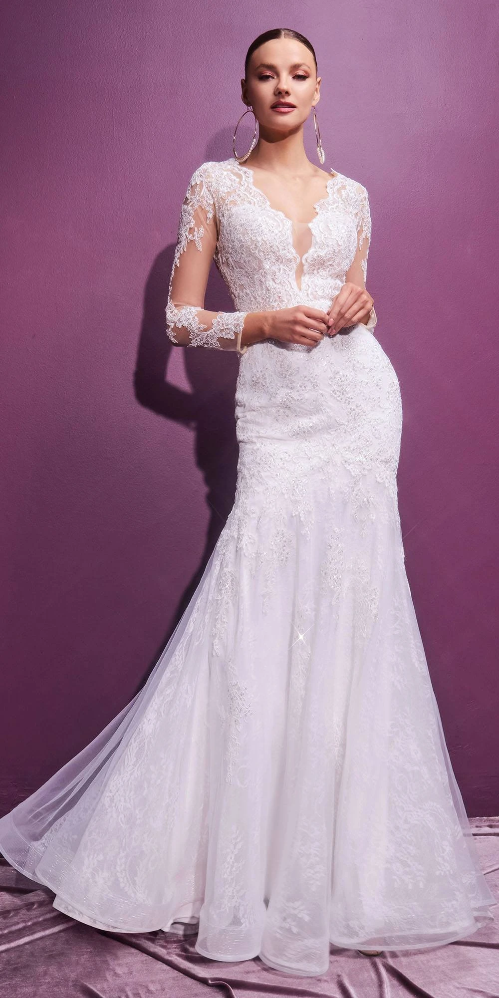 Imagine yourself wearing this long, beautiful lace wedding gown for your next special event! This mermaid floor length wedding dress by Cinderella Divine CD951W in off white features with long illusion sleeves and lace applique. Â The deep V-neckline has scalloped edging and open keyhole back. Â A truly stunning mermaid wedding gown that will make your wedding extra memorable!