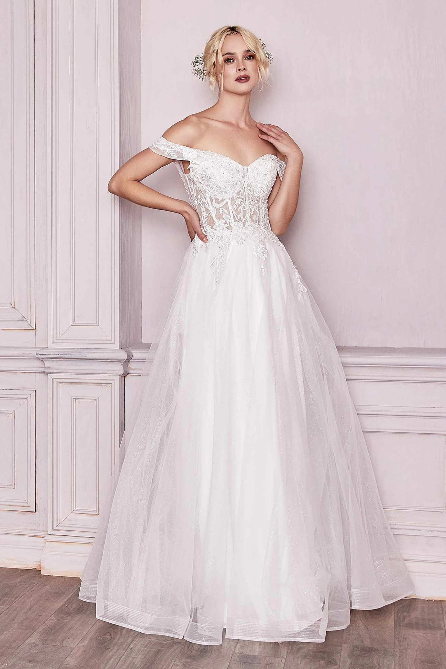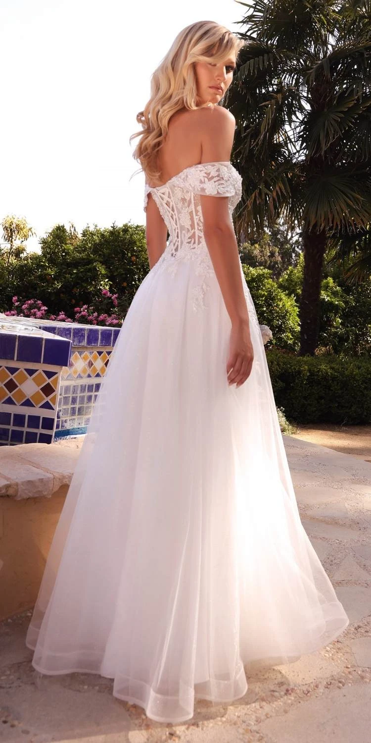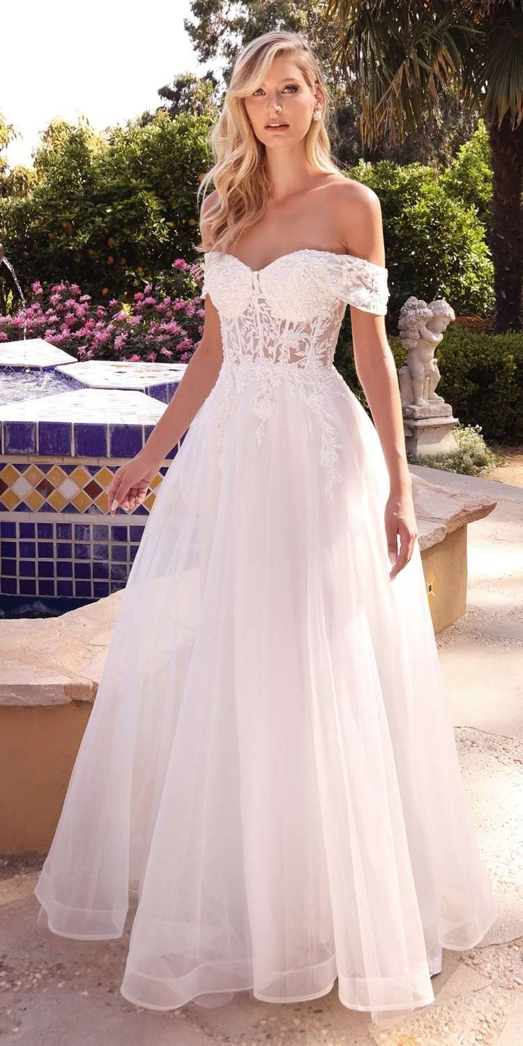 Imagine yourself wearing in this stunning floor length A-line evening gown by Cinderella Divine CD961W for your next formal event.  Garden wedding ready, this layered tulle A-line dress is a princess €š¬š ¬ €š¬ž ¢s dream. Off the shoulder lace sleeves applique into a corseted sheer bodice. The lace up back allows for a perfect fit to sway the night away.  An ideal full-length dress for red carpet events, pageant, prom or in any other formal occasions! Â