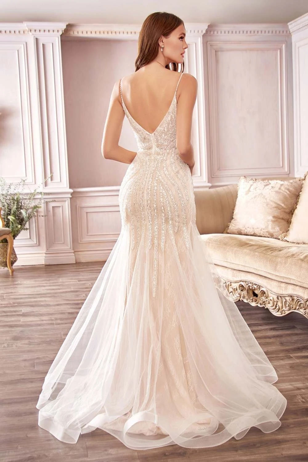 Imagine yourself wearing this long stunning formal bridal gown for your next special event! This mermaid floor length formal wedding dress by Cinderella Divine CDS401 in off white will accentuate your hourglass shape with a dramatic floor-sweeping mermaid skirt. Sheer layered tulle and Chantilly lace is embellished with beading that shimmers as you move. The dress features a deep illusion V-neckline with a sheer insert panel that turns to reveal a low open V-back, delicately suspended by beaded spaghetti straps. The dress is lined with stretch lining for the wearer’s comfort. An ideal full length dress for weddings.