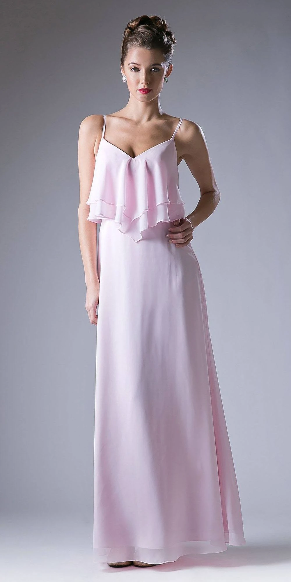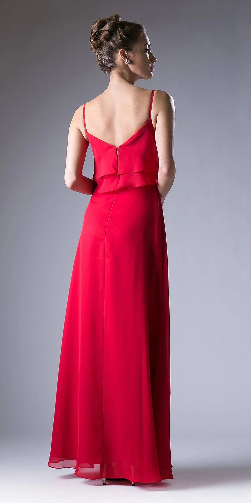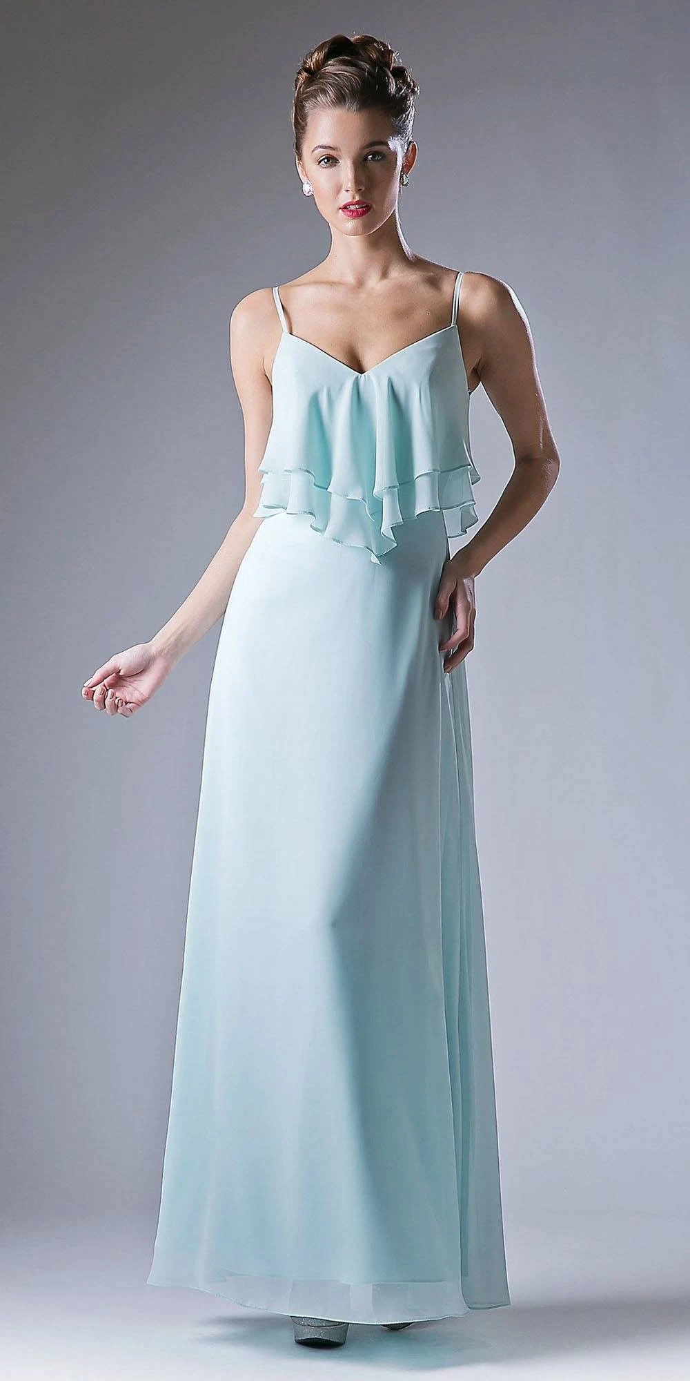 Imagine yourself in this beautiful chiffon long bridesmaids dress, which features a spaghetti strap and a plunging v-shape neckline with layered ruffles in the bodice. An a-line silhouette dress perfect for any type of body figure.