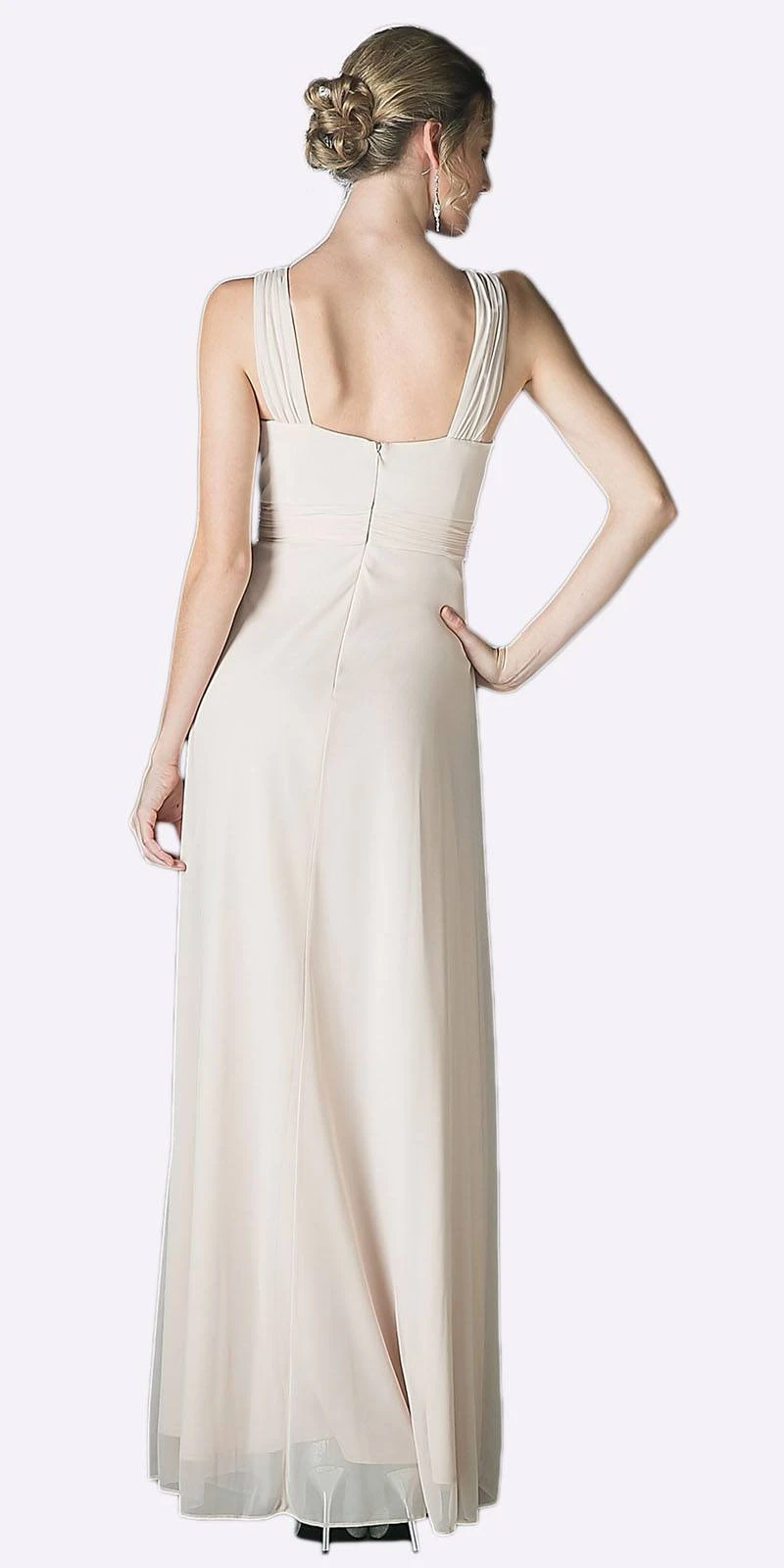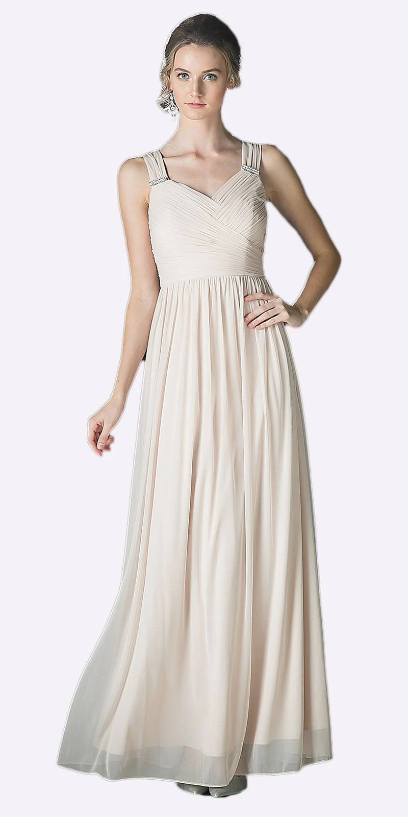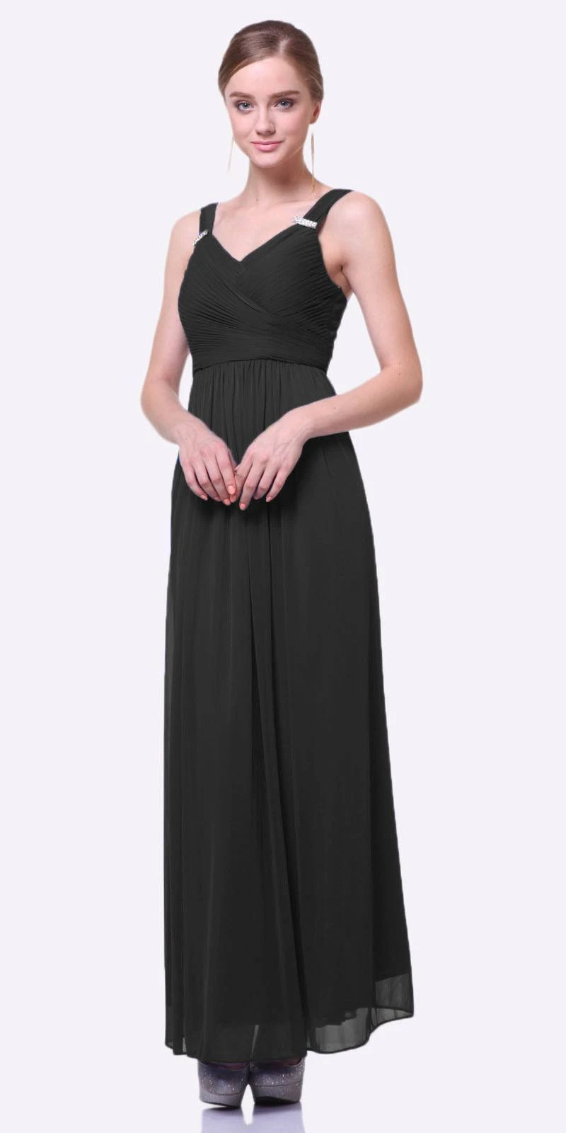 CLEARANCE ITEM – Enjoy the evening in this lovely long chiffon semi formal dress. This A line flowy semi formal dress has two wide tank straps with brooch clips, pleated bodice and empire waist.