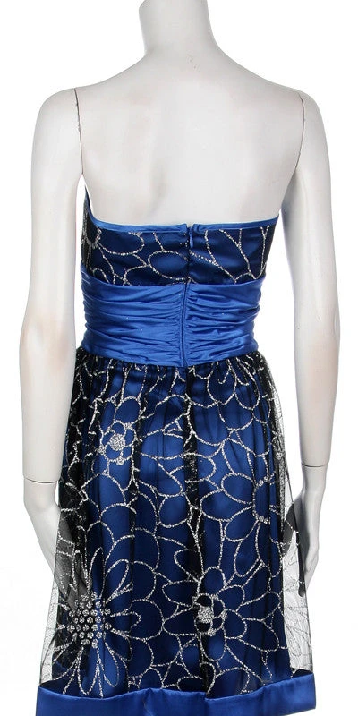 CLEARANCE ITEM – Look your best for the night in this timeless A-line dress by Juliet 2170. With a strapless, straight neckline, glitter mesh overlay skirt and knee length cut, this design offers an elegant, classic silhouette. The sleeveless design is perfect for a special event.