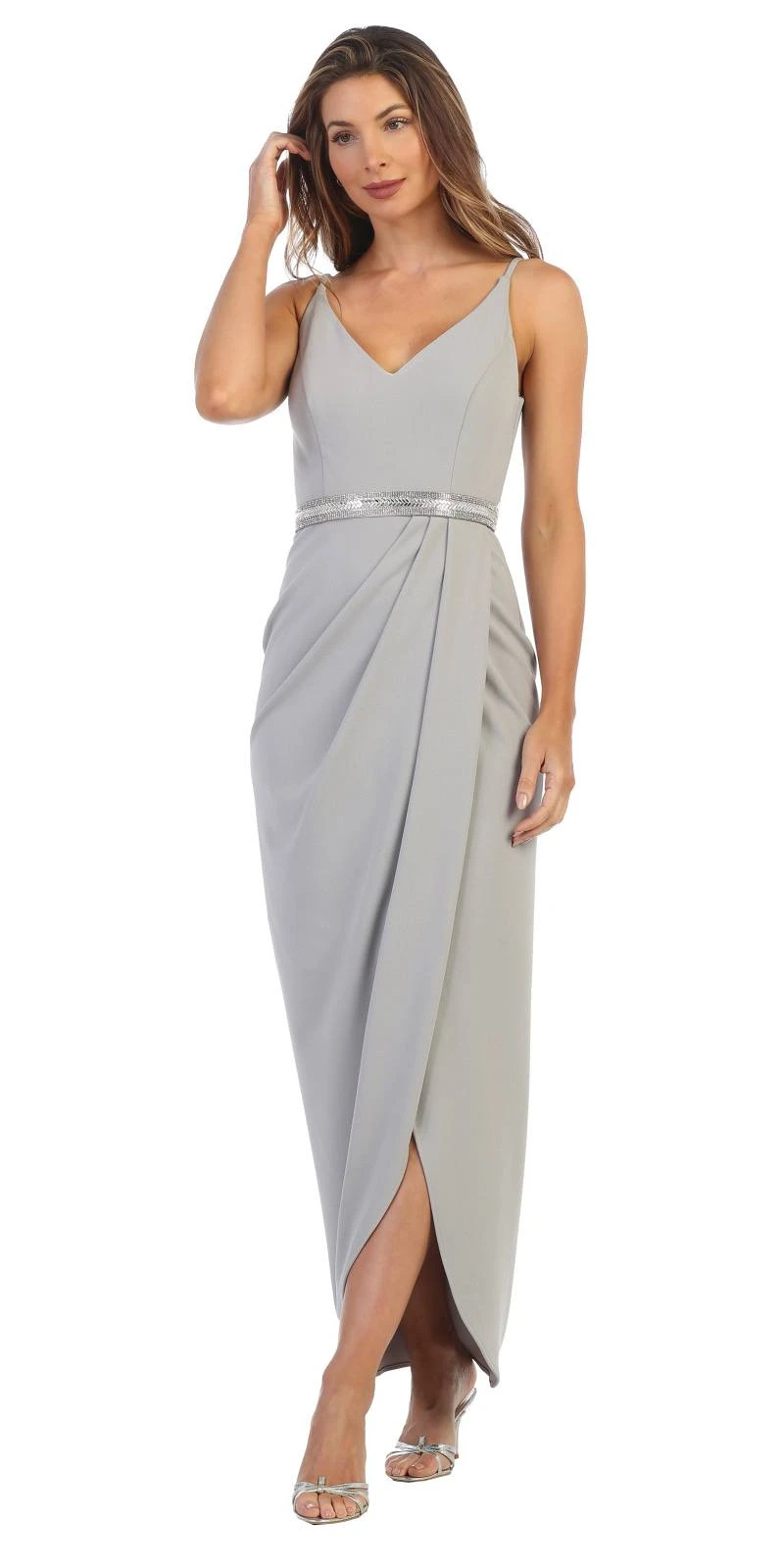 CLEARANCE ITEM – Enjoy the evening with this faux-wrap style long formal dress by Juno 1034. This dress is made of stretch crepe which feature a v-neck and back with zipper closure. The faux-wrap style emphasized by the pleating details crowns with shimmering band wraps around the natural waist. This lovely dress is perfect wedding events or in any other formal occasions!LAST ONE LEFT!