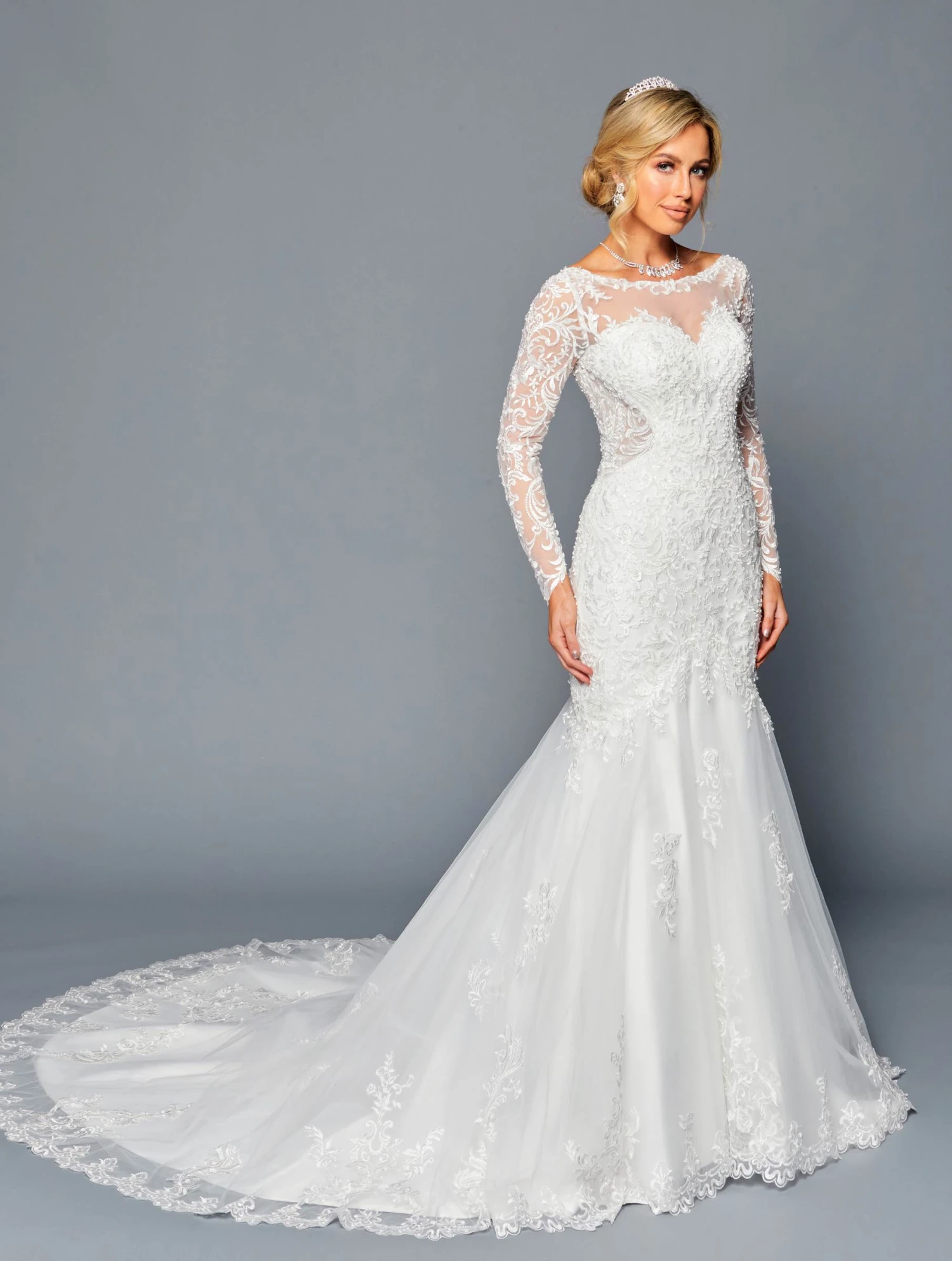 Imagine yourself in this beautiful floor length trumpet wedding ball gown for your upcoming wedding or debutante! This long sleeve dress by DeKlaire Bridal 450 features a boat neckline, beaded lace applique and court train.