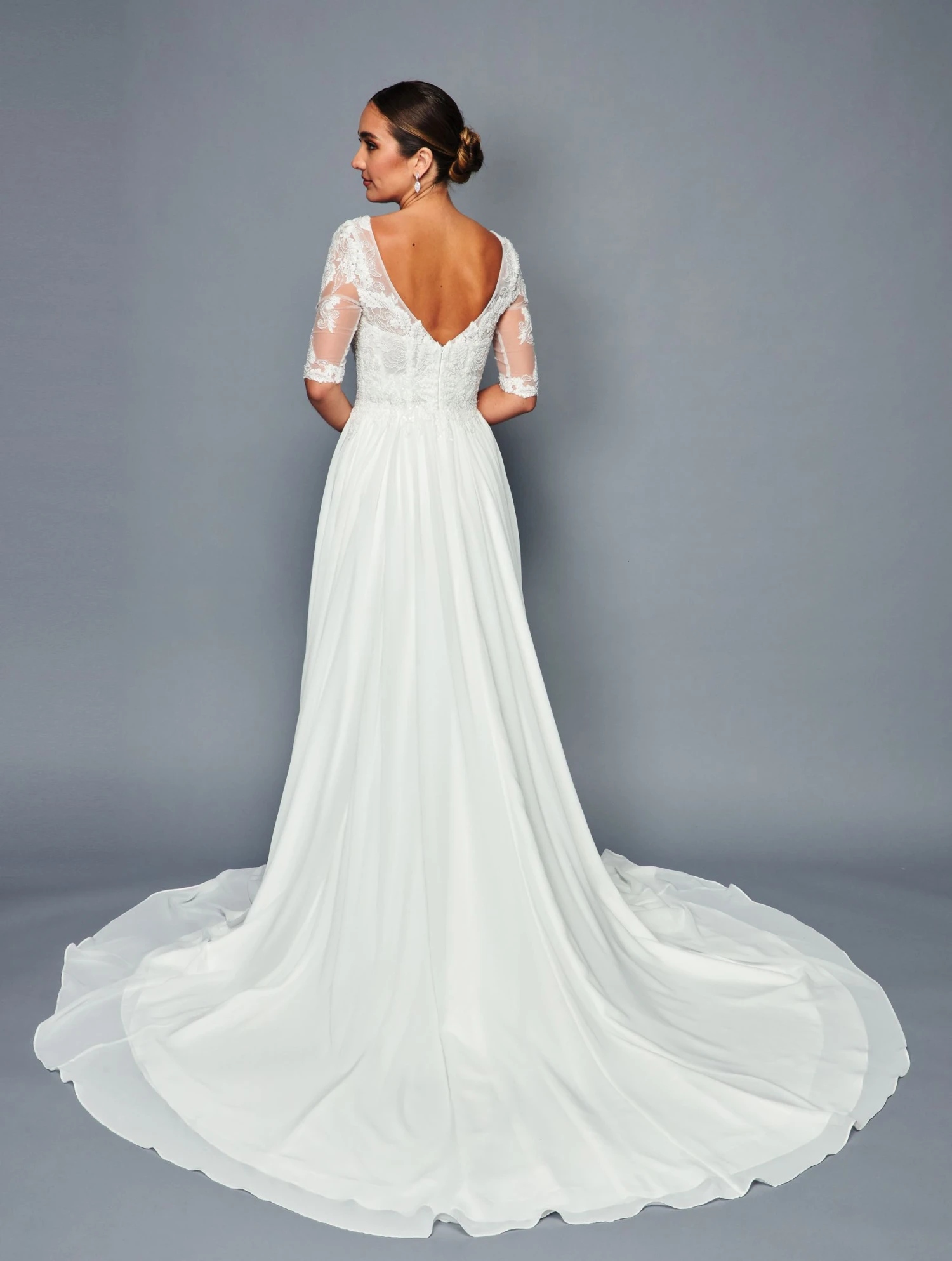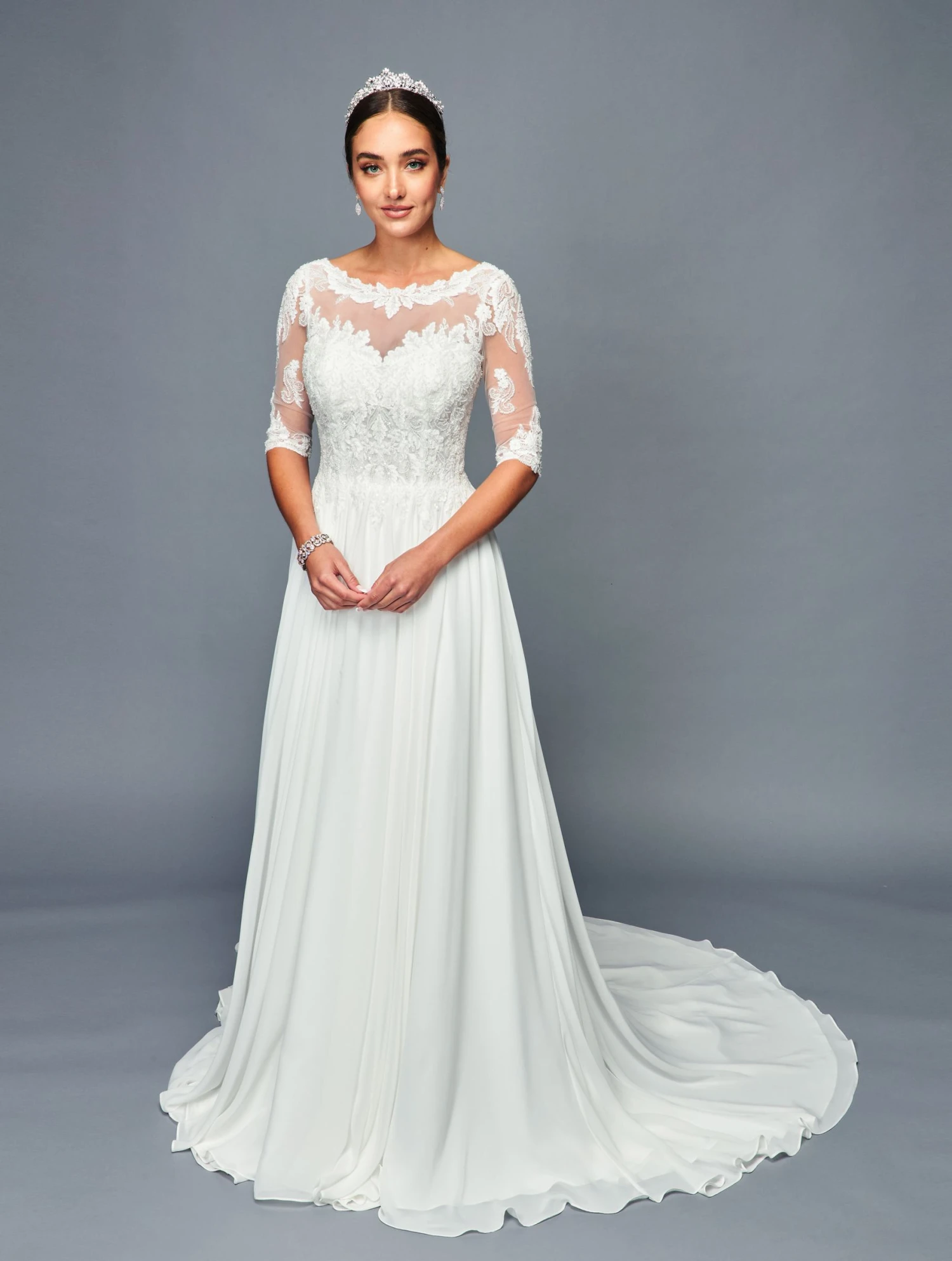 Imagine yourself wearing this beautiful floor length A-line gown for your upcoming wedding or debutante by DeKlaire Bridal 468. Elegant boat neckline illusion 1/2 sleeve chiffon A-line court train wedding dress with beaded lace sequins applique. A beautiful wedding dress to make your day feel extra special!