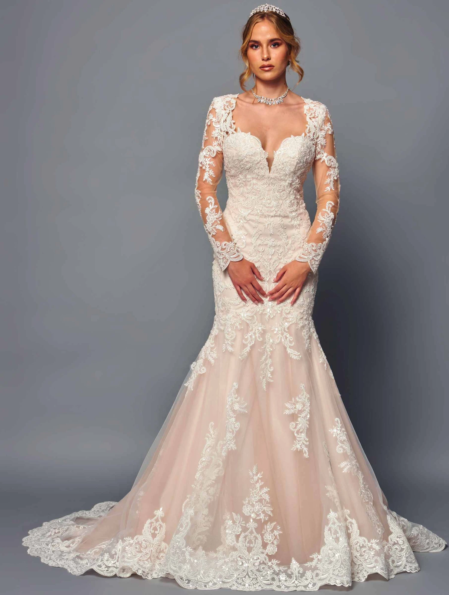 The DeKlaire Bridal 491 wedding dress features an elegant queen Anne neckline and nude illusion long sleeves. Its trumpet/mermaid silhouette creates a stunning figure while the corset boned bodice provides a secure fit. The beaded lace sequins applique adds a touch of glamour, and the illusion corset lace-up tie back completes the look. Perfect for a sophisticated and modern bride.