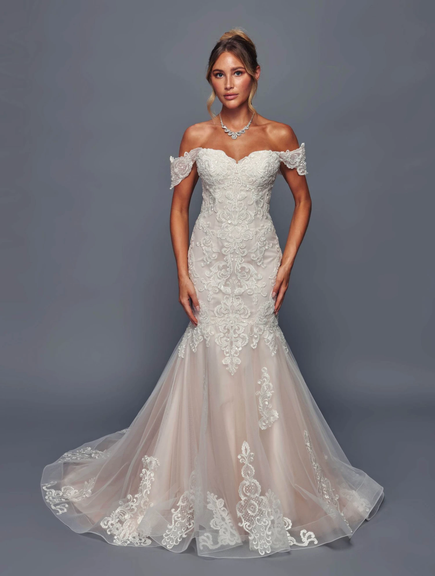 Expertly designed by Deklaire Bridal 495, this off-the-shoulder wedding dress with a stunning mermaid silhouette is sure to make you feel like royalty on your special day. The intricate beaded lace sequins applique adds a touch of elegance to the tulle trumpet skirt and embroidered lace bodice. Complete with a flattering corset lace-up tie back and court train, this dress is the epitome of classic beauty.