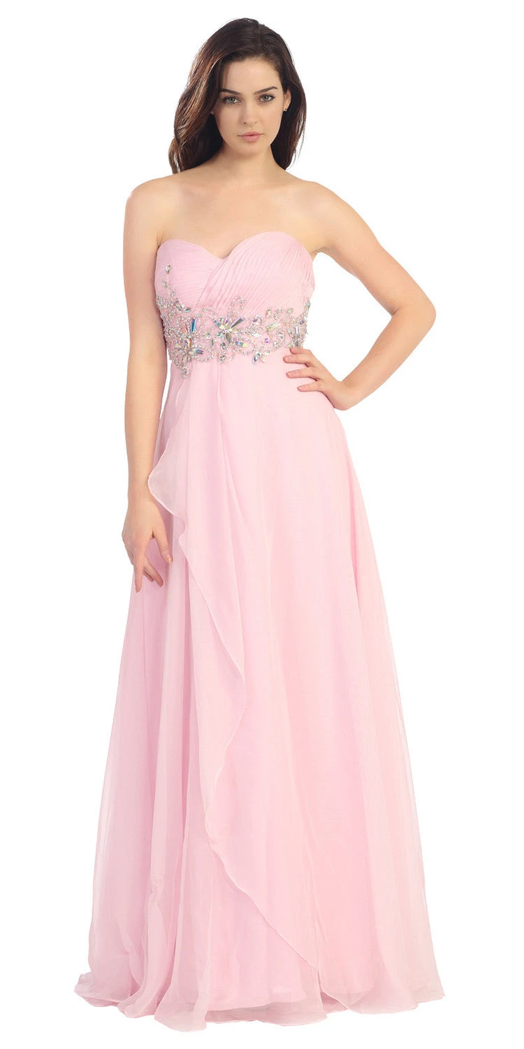 Create a glamorous look for yourself by slipping on this ravishing gown for a military ball or a chic prom party. This strapless gown in coral flaunts an A-line design that flatters your silhouette in a charming manner. A sweetheart neckline shapes a ruched bodice, while an intricate arrangement of rhinestones clinch the natural waistline in an appealing manner. This floor-length gown features an overlapping design that creates a layered look for extra beauty.