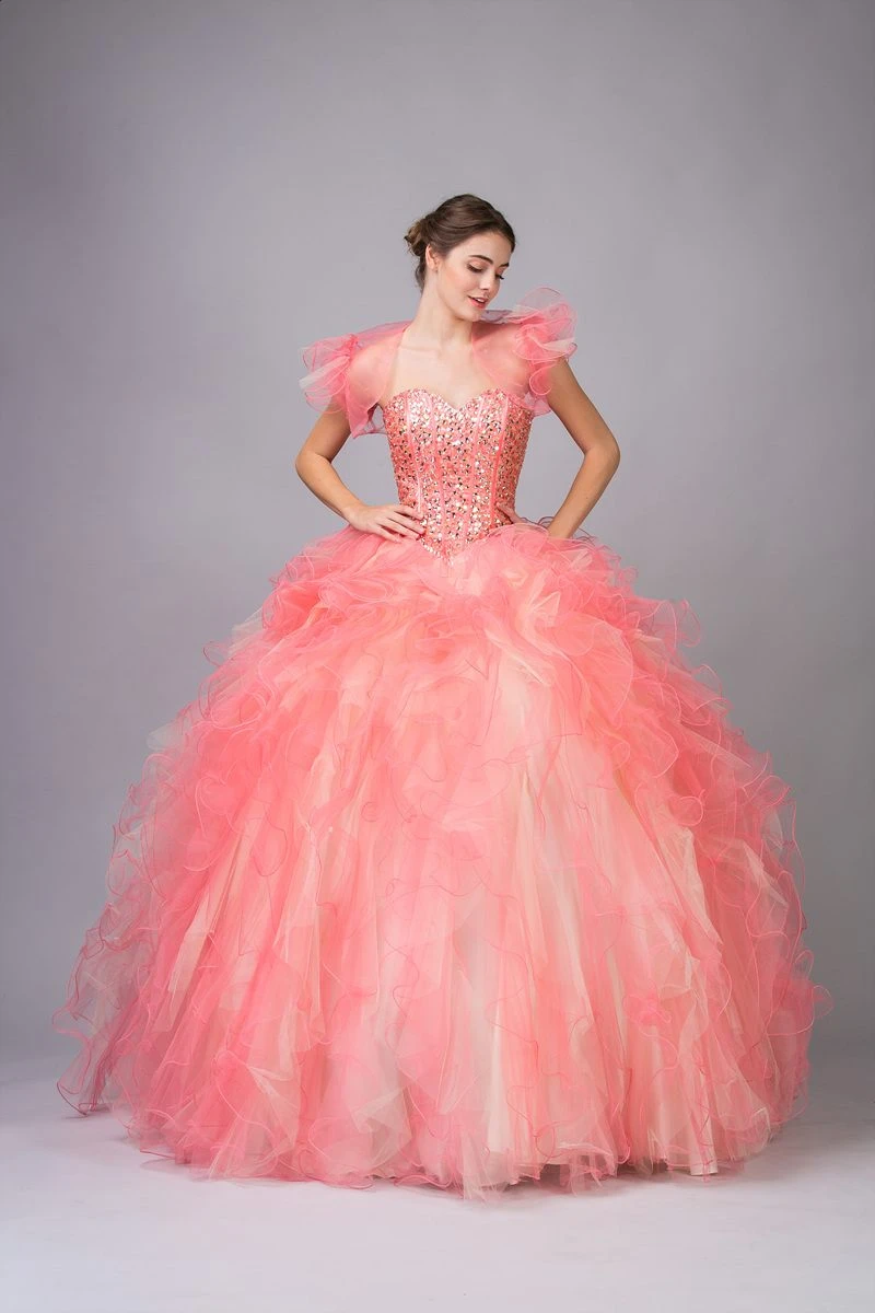 Beautiful quinceanera gown in coral with exquisite beading across the boned bodice. This A line poofy dress has a strapless sweetheart and plenty of mesh layering.
