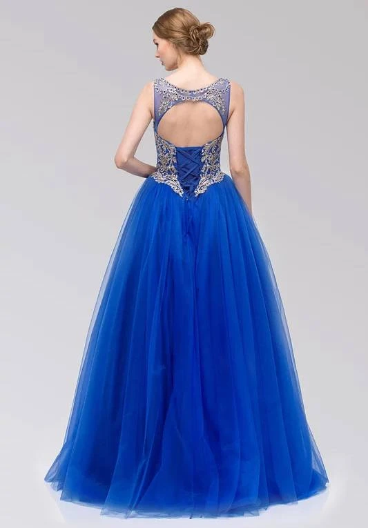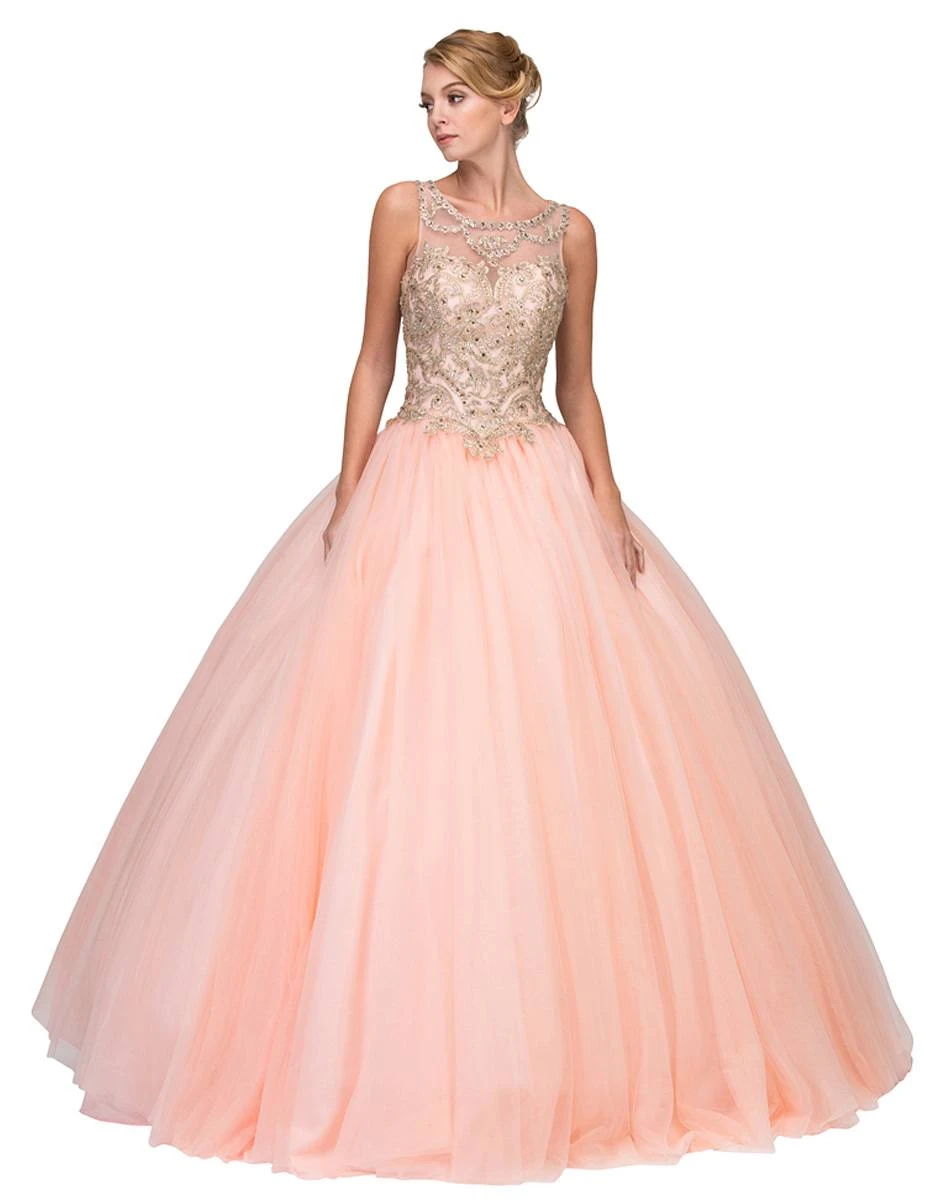 Shine and stand out with this gorgeous quinceanera gown by Eureka Fashion 3188. Gold lace appliques intricately decorated the bodice, the illusion neckline and the corset lace up back with cut-out. A mesh fabric that delicately flows down the floor completes the fabulous look for prom, birthday celebrations or any other formal occasions.Â