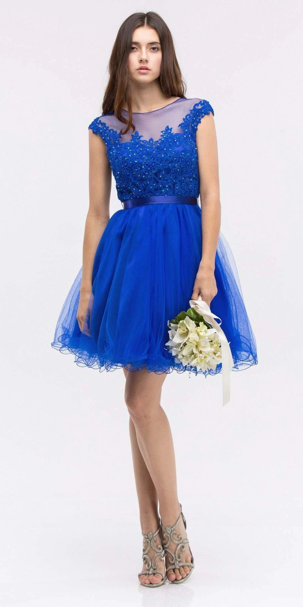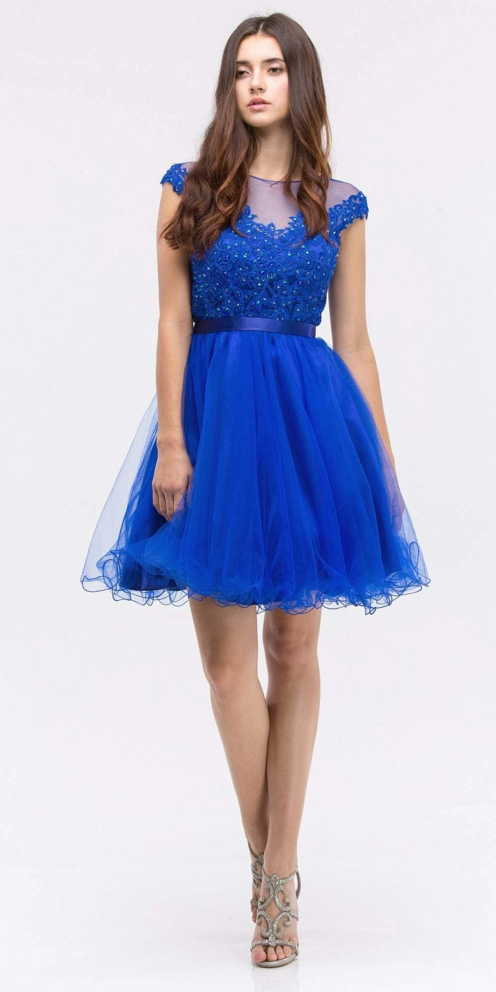 Short homecoming dress, cap sleeves by Eureka Fashion 3622 A-line silhouette dress with lace applique bodice, satin waistband accent and mesh curly hem skirt.