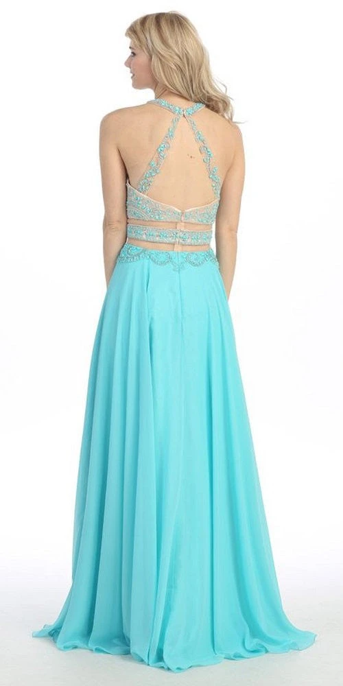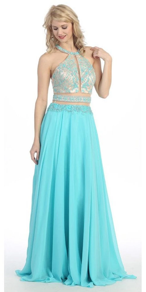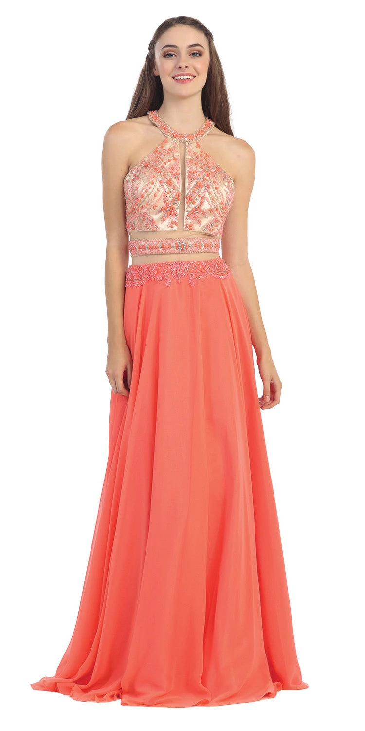 EXTREMELY REDUCED PRICE – While supplies last! – Floor length chiffon gown with exquisitely beaded top. Beaded belt design falls at the center of the dress to accentuate slimming waistline. Nude mesh connects between exposed areas of the dress – so maybe we can get away with those no bare midriff rules.