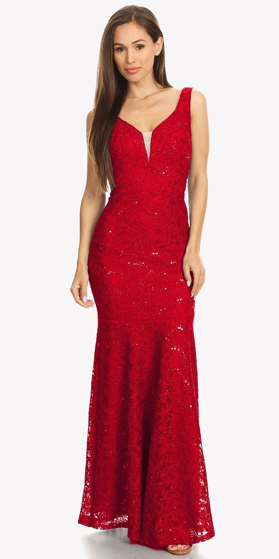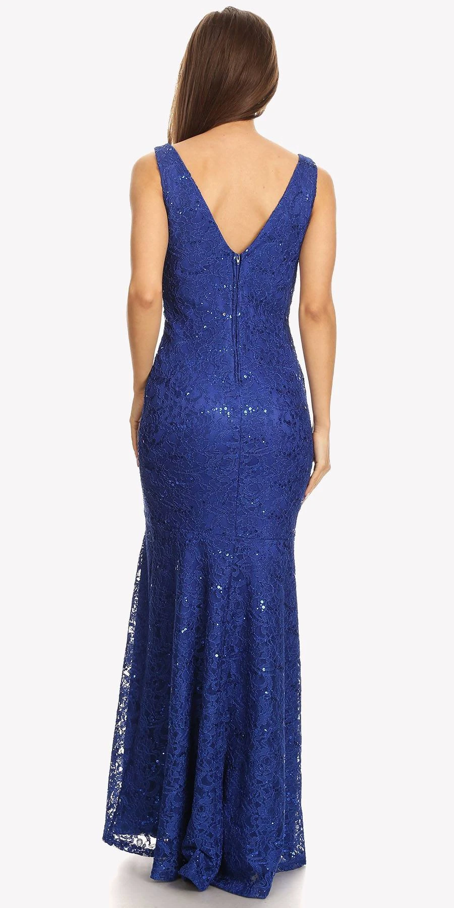Shine and stand out in this gorgeous long evening gown by Eureka Fashion. This long formal mermaid silhouette dress is sleeveless, plunging v-neckline with mesh panel and V-shape back. Made of lace with sequins, have this curve hugging dress on your next formal occasions.