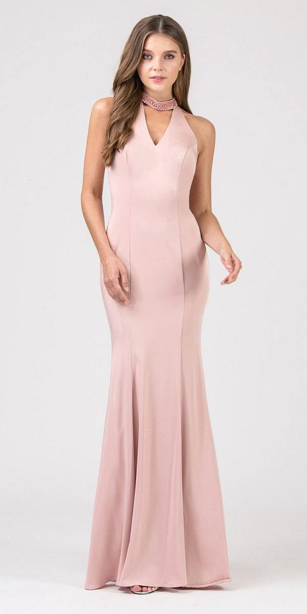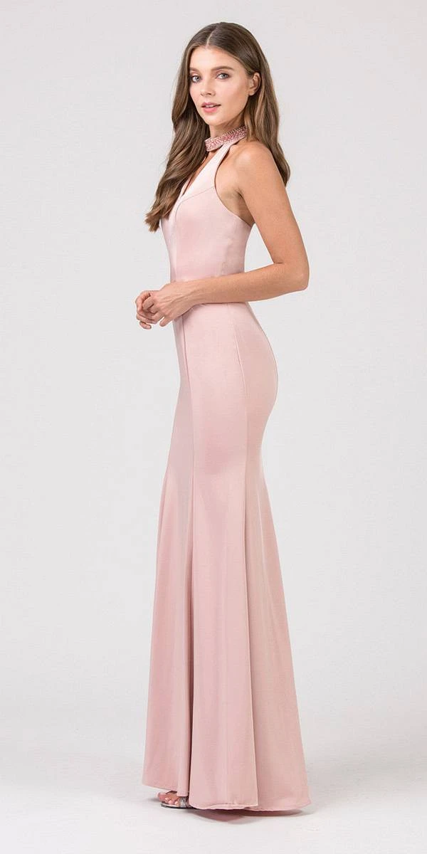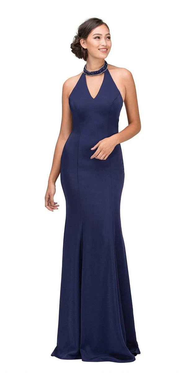 Shine and stand out in this gorgeous fitted long evening prom gown by Eureka Fashion 5033 in hunter green. This mermaid silhouette gown features a beaded choker-collar, v-shape halter neckline and slightly low open back. Made of stretchy satin this floor length dress is an excellent attire for red carpet events, prom, awards night and any other formal events.