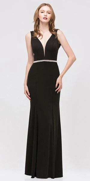 Shine and stand out in this gorgeous long evening prom gown. This floor length heavy ITY jersey dress has wide straps with a deep V neckline and features dazzling beaded stones across the waist.