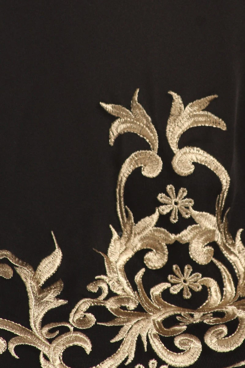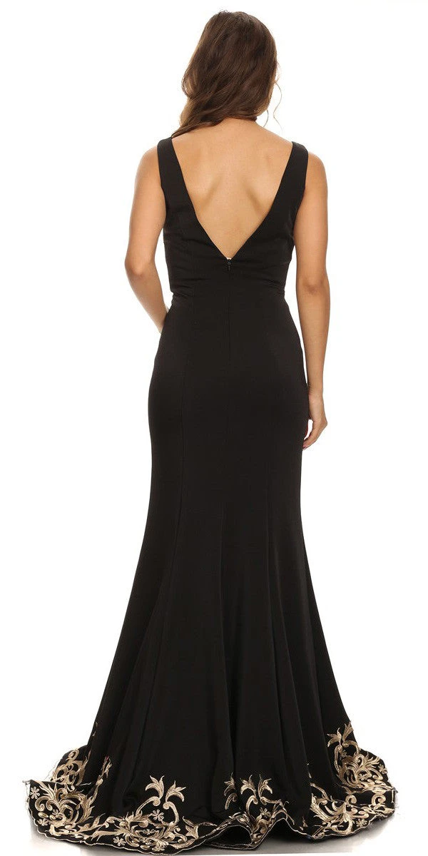 Shine and stand out in this gorgeous long evening gown. This floor length stretch satin A-line dress has wide straps with a V-neckline and features a low back and embroidered design at the bottom hem.