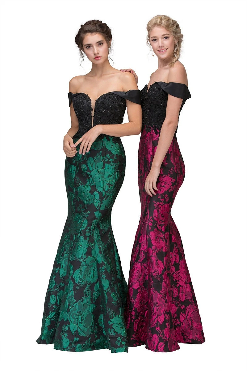 Stand out and shine wearing this contemporary outfit by Eureka Fashion 6222. The top of this dress is decorated with appliques topped with tiny beads. It has a plunging sweetheart neckline with sheer inset. The mermaid skirt is made of special floral printed fabric. A sexy evening gown, excellent outfit for prom, gala, awards night or any other formal events.
