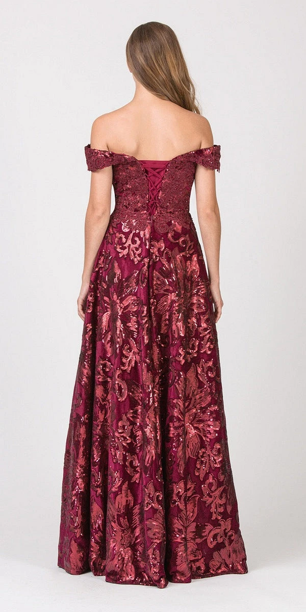 Classic a-line silhouette elegant gown with appliqued bodice, sheer-inset v-neck, corset lace-up back, pockets and floral-patter sequins over the velvet skirt. A dress by Eureka Fashion 6733 in burgundy, an impressive outfit for prom, red carpet events, awards night or any other formal occasions.