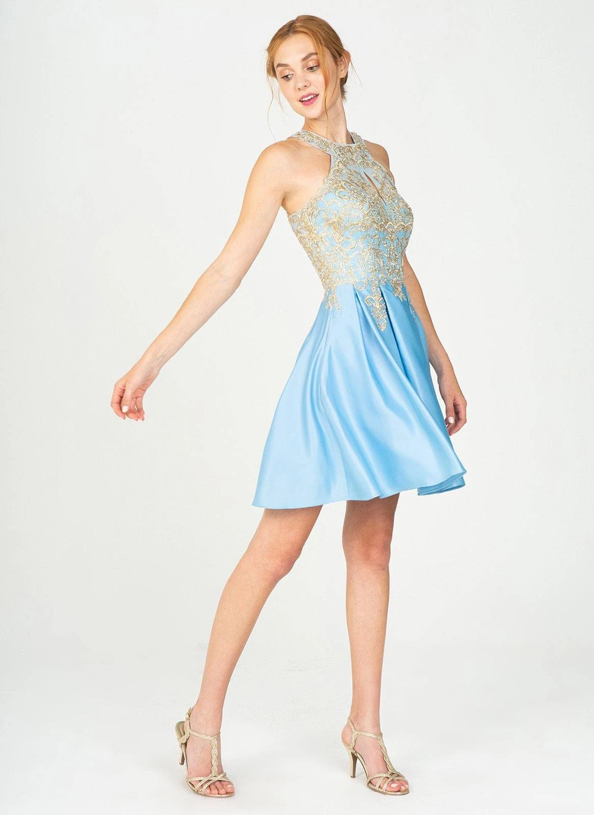 Shine and stand out in this stunning made of satin short party dress in by Eureka Fashion 8019. The bodice of this A-line short dress is exquisitely decorated with appliques which features a high-collar with keyhole neckline and pleated skirt with pockets. A perfect dress for homecoming, sweet-sixteen and graduation parties or in any other special celebrations!
