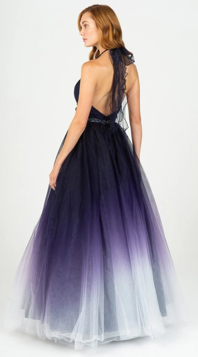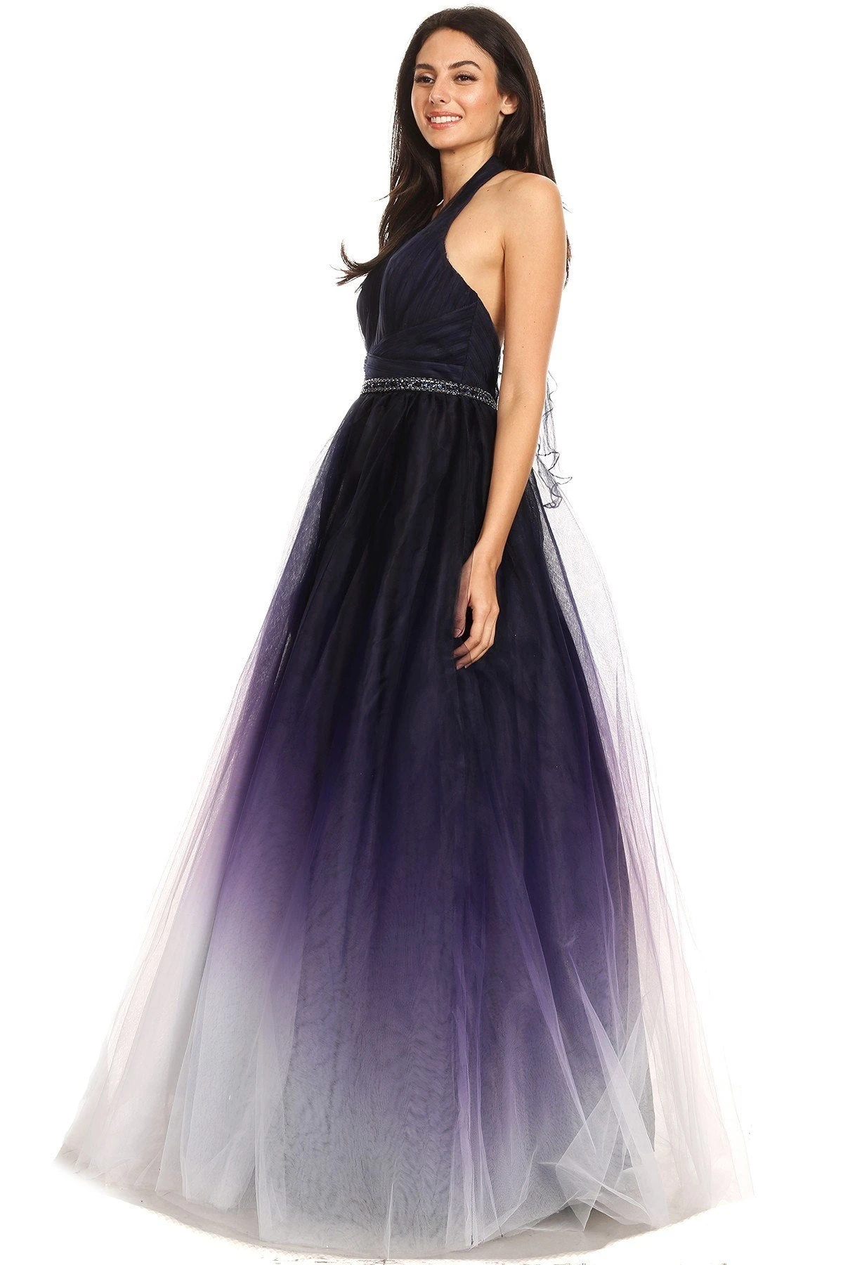 EXCLUSIVE STYLE! Stand out and shine with this floor length navy blue ombre halter style A-line ball gown by Fashion Eureka 8777. Featuring v-neckline with beaded band wraps around the natural waist. This made of ombre mesh ball gown is a fabulous outfit for prom, red carpet events, birthday celebrations or in any other formal occasions.