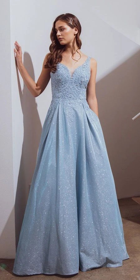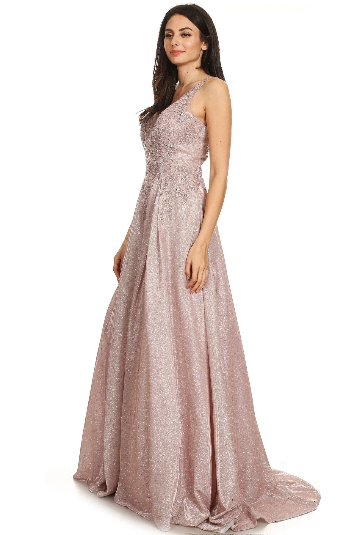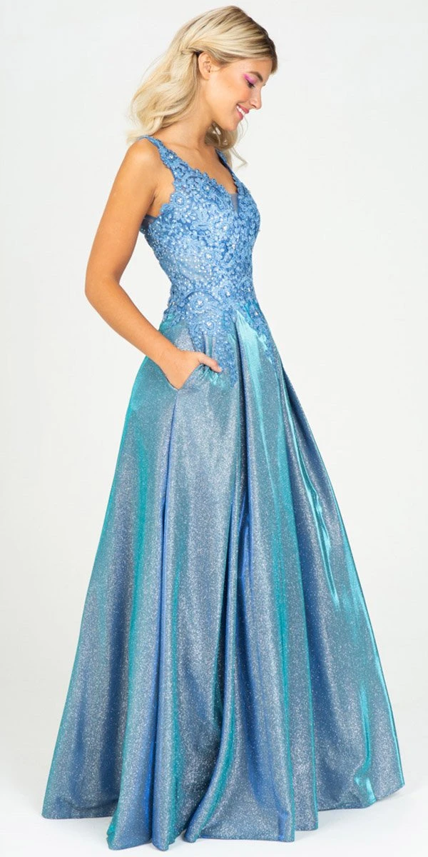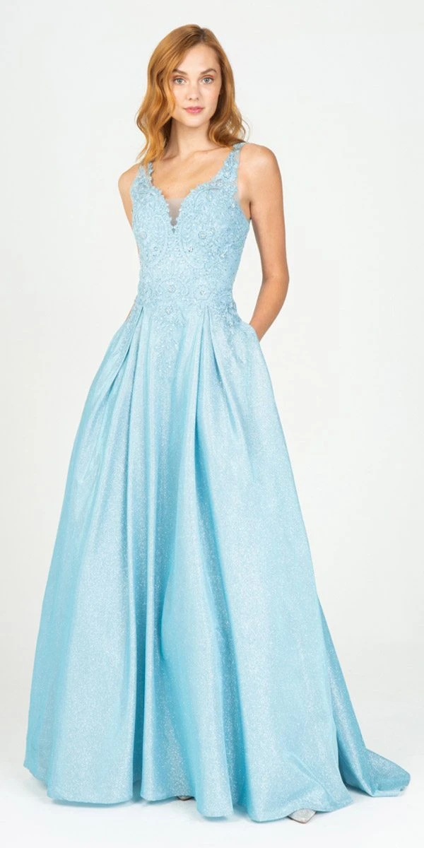 Stand out and shine with this A-line silhouette long formal dress by Eureka Fashion 9606. Made of shimmering fabric this ball gown features an applique and bead embellished bodice, the same appliques cascade down to the voluminous skirt with pockets and sweeping train. With V-neck and back this simple yet stunning gown is an excellent outfit for prom, red carpet events, gala dinner party or in any other special celebrations.