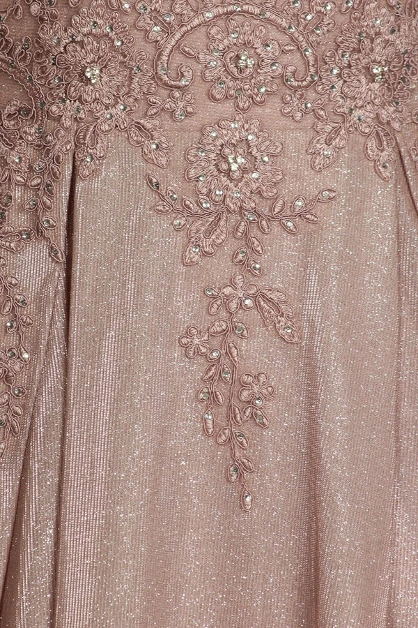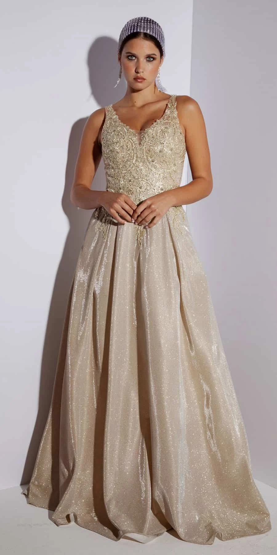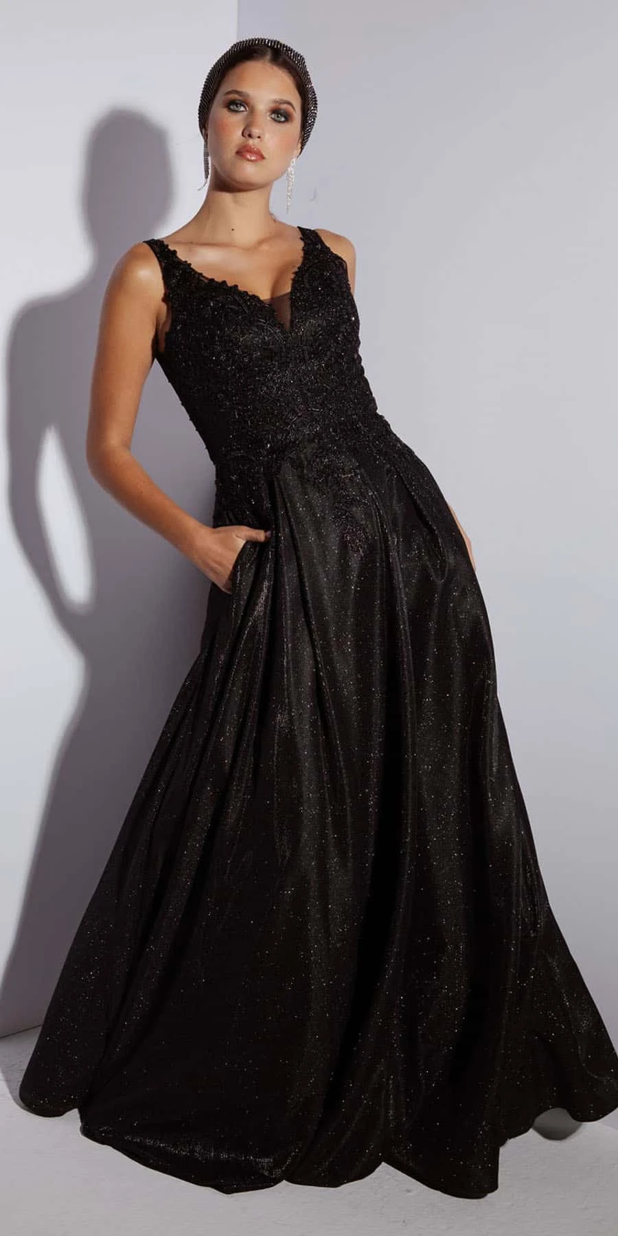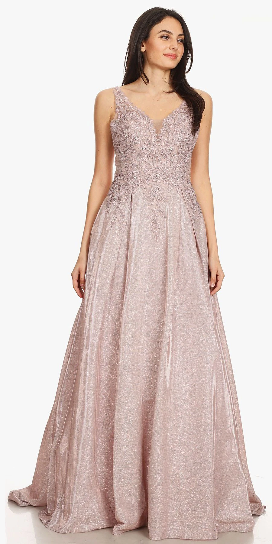 Stand out and shine with this A-line silhouette long formal dress by Eureka Fashion 9606. Made of shimmering fabric this ball gown features an applique and bead embellished bodice, the same appliques cascade down to the voluminous skirt with pockets and sweeping train. With V-neck and back this simple yet stunning gown is an excellent outfit for prom, red carpet events, gala dinner party or in any other special celebrations.