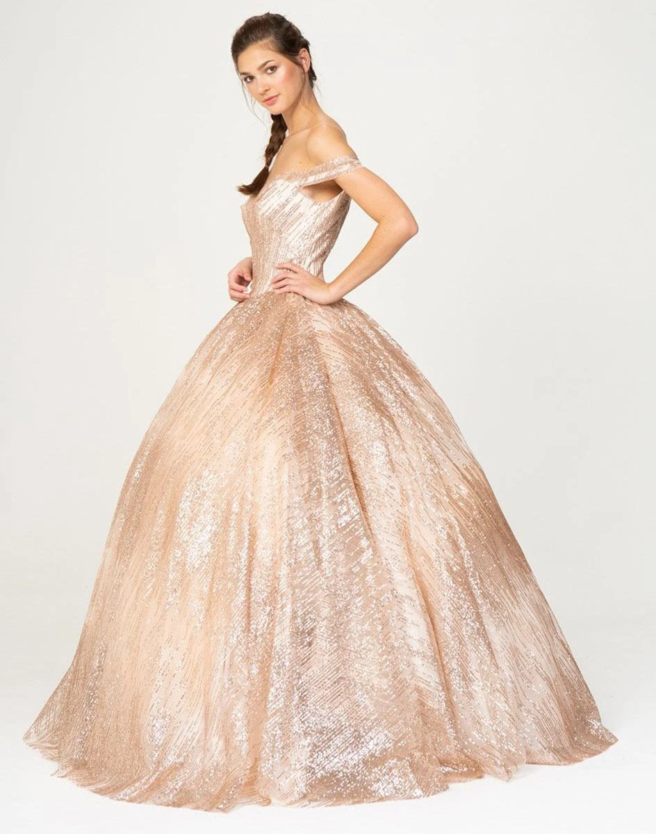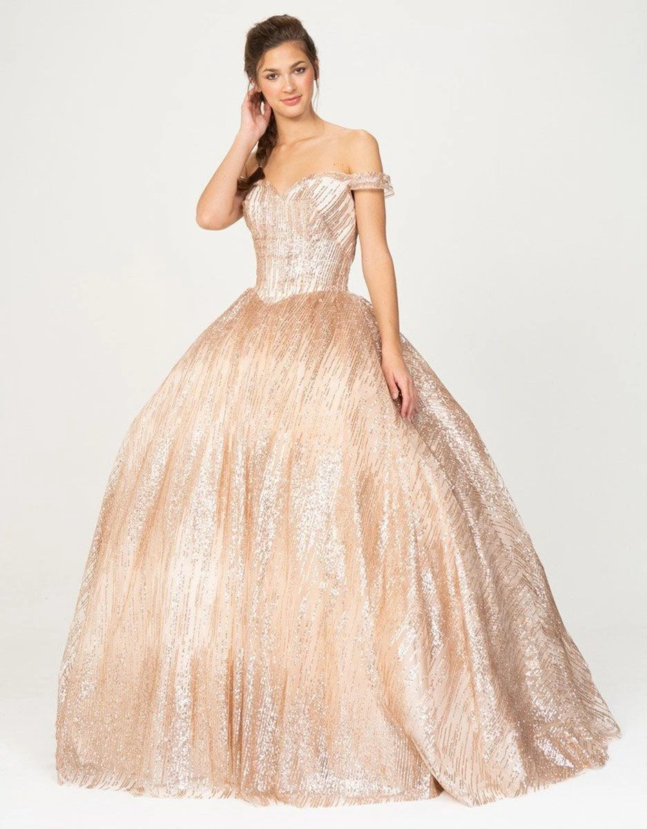 Shine and stand out in this glowing ball gown by Eureka Fashion 9616. Made of glitter mesh this quinceanera dress features the trendy off-the-shoulder style with sweetheart neckline and corset lace-up back. Fitted bodice shaped a flattering basque waistline and grandiose ball gown lined with comfy fabric. Feel like a princess and enjoy quinceanera celebration or prom with this glittering ball gown!