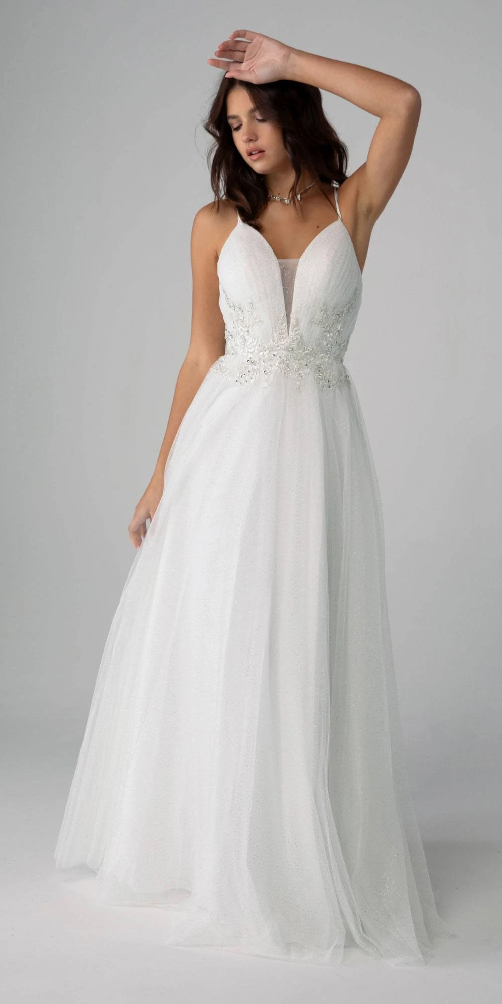 Shine and stand out in this gorgeous ball gown by Eureka Fashion 9797. Made of glitter-mesh with silky satin underlay, this long formal dress features a deep v-neck with sheer-inset, adorned with pretty appliques.  A double spaghetti straps that supports the ruched bodice beautifully crisscross on the back and formed a stylish lace-up back. This lovely dress is perfectly made for prom, red carpet events, galas, wedding or in any other formal occasions!