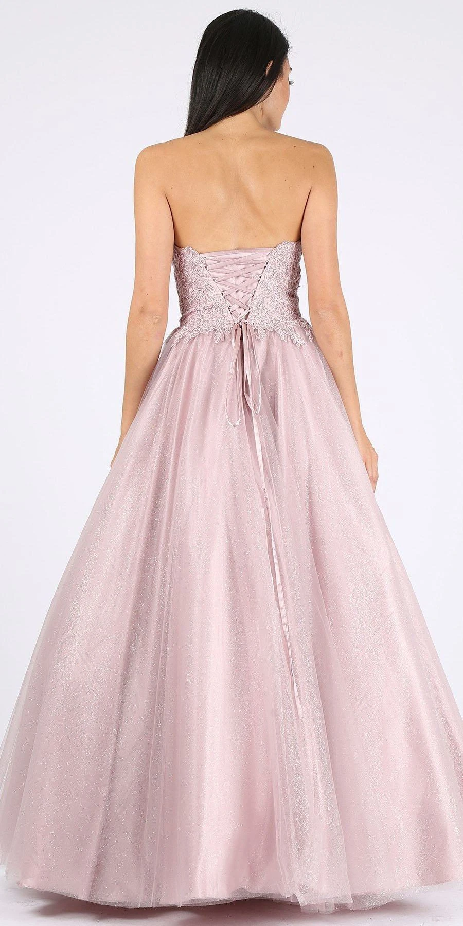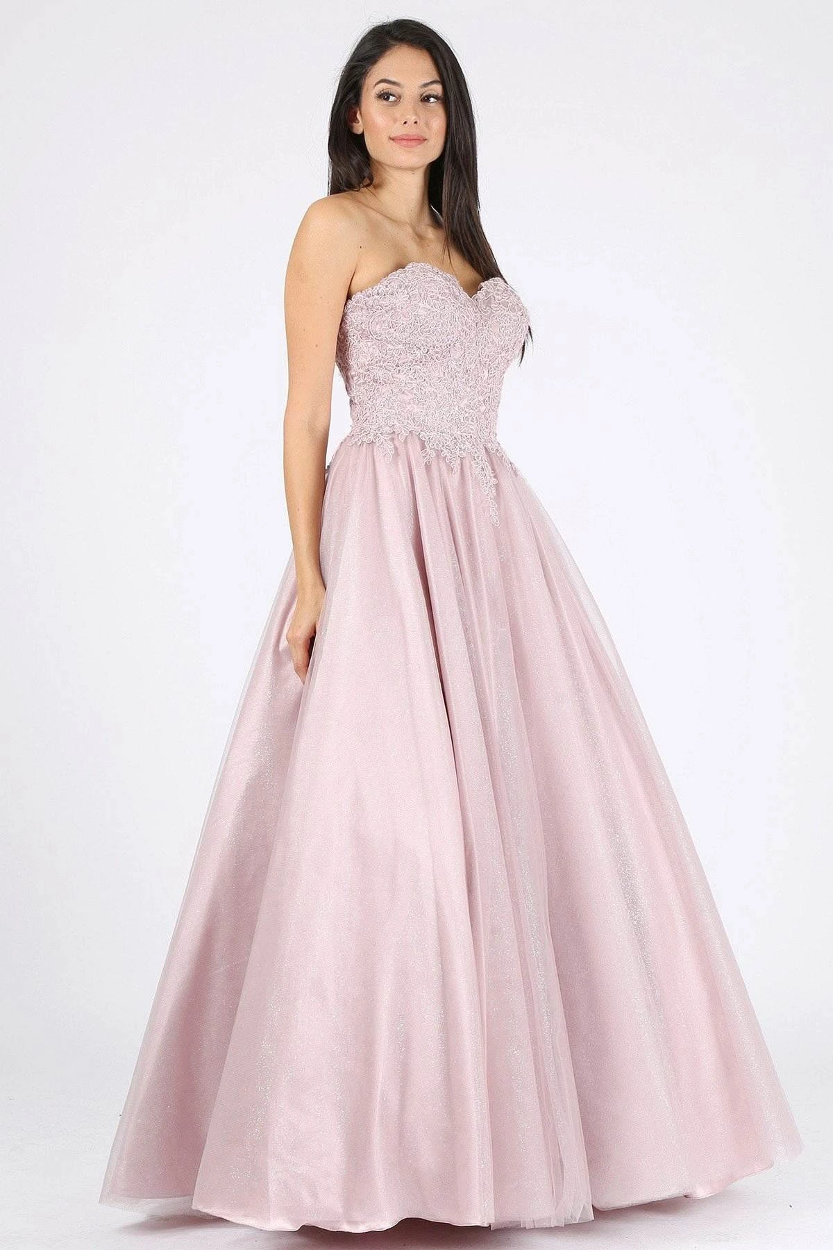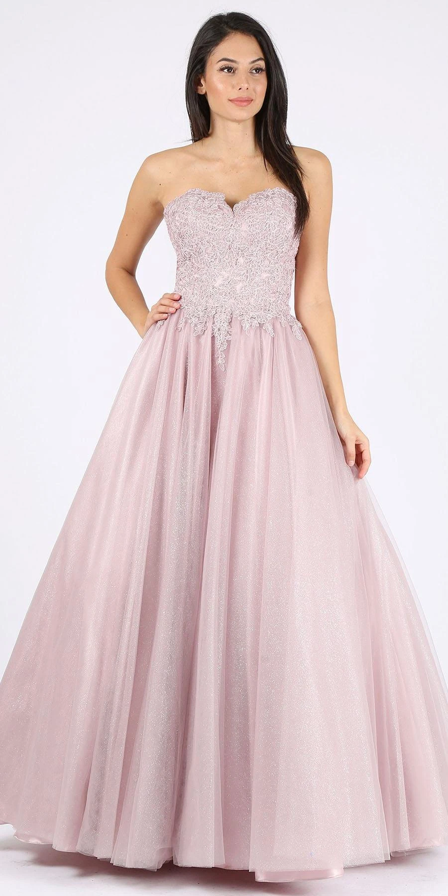 This strapless ball gown by Eureka Fashion 9898 in victorian lilac features a fitted bodice which is completely decorated with lace appliques matched with voluminous mesh glittery skirt. This strapless ball gown features a sweetheart neckline and corset lace-up back. A fabulous long formal dress perfect for prom, quinceanera, red carpet events or in any other formal occasions!