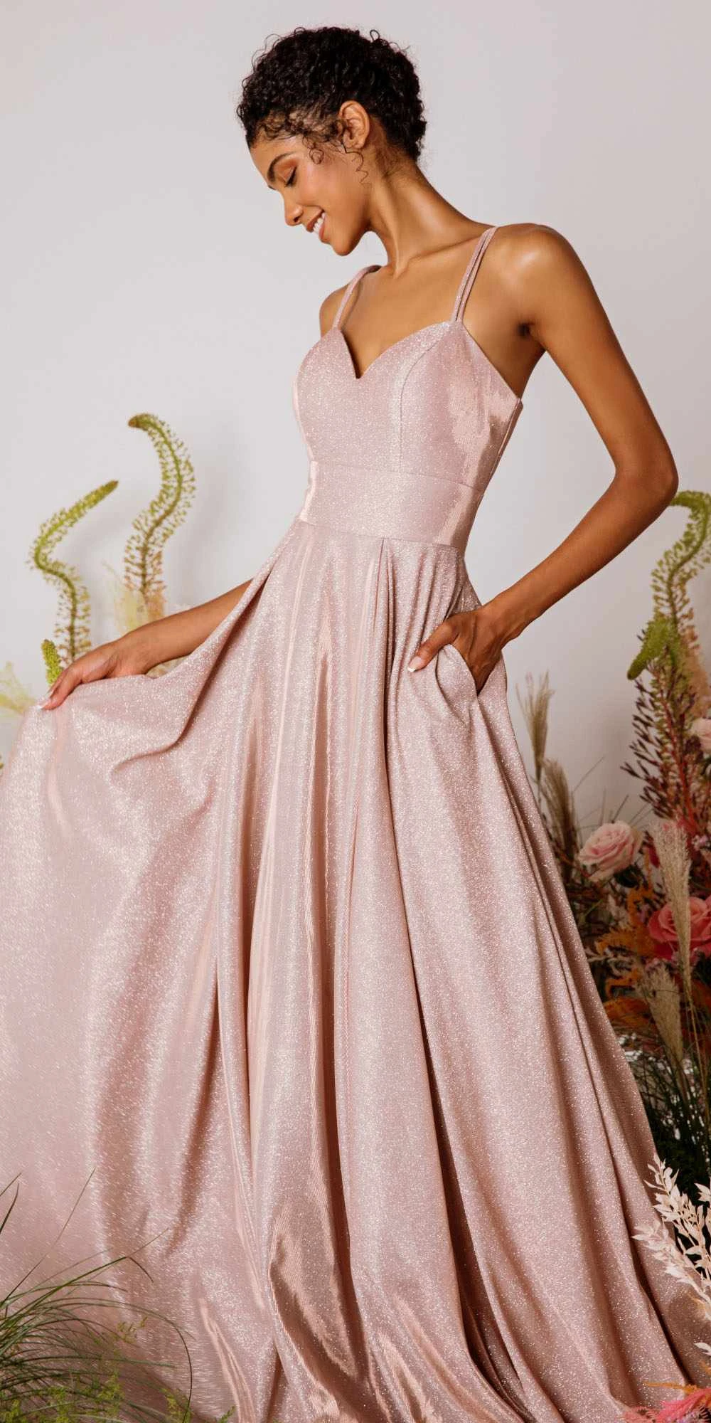 Imagine yourself wearing this long formal evening gown for your next special event by Eureka Fashion 9977. Floor length sparkly gown with corset, pockets and zipper back. An ideal full-length dress for red carpet events, pageant, prom or in any other formal occasions!Â