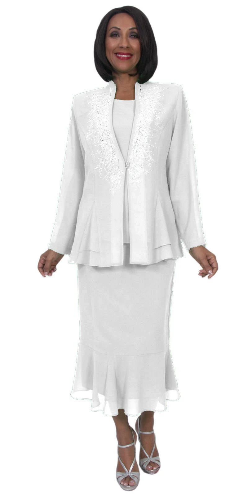 If modesty and classy is important, then you’ll love this plus size 3-piece dress by Hosanna Design 5259 for your next special occasion! This 3-piece set includes a sleeveless top and tea length skirt and features silver rhinestones along the long sleeve jacket.