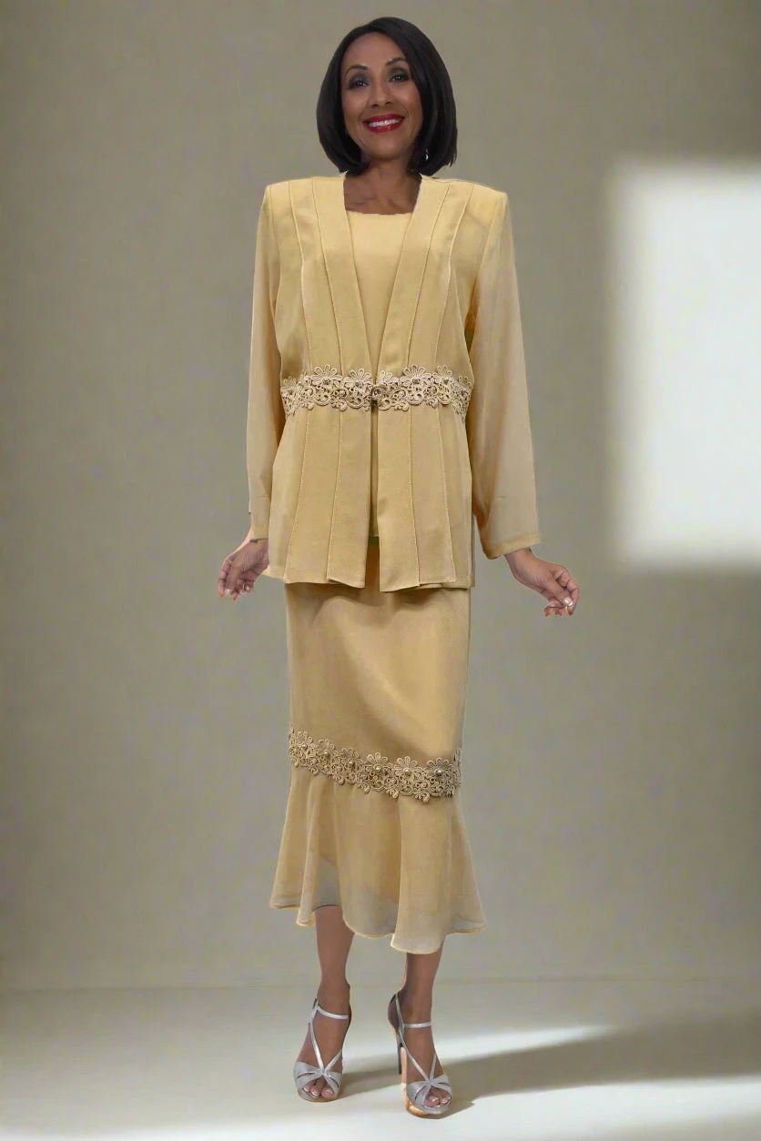 If modesty and classy is important, then you’ll love this plus size 3-piece dress by Hosanna Design 5578 for your next special occasion! This 3-piece set includes a sleeveless top and tea length skirt and a long sleeve jacket